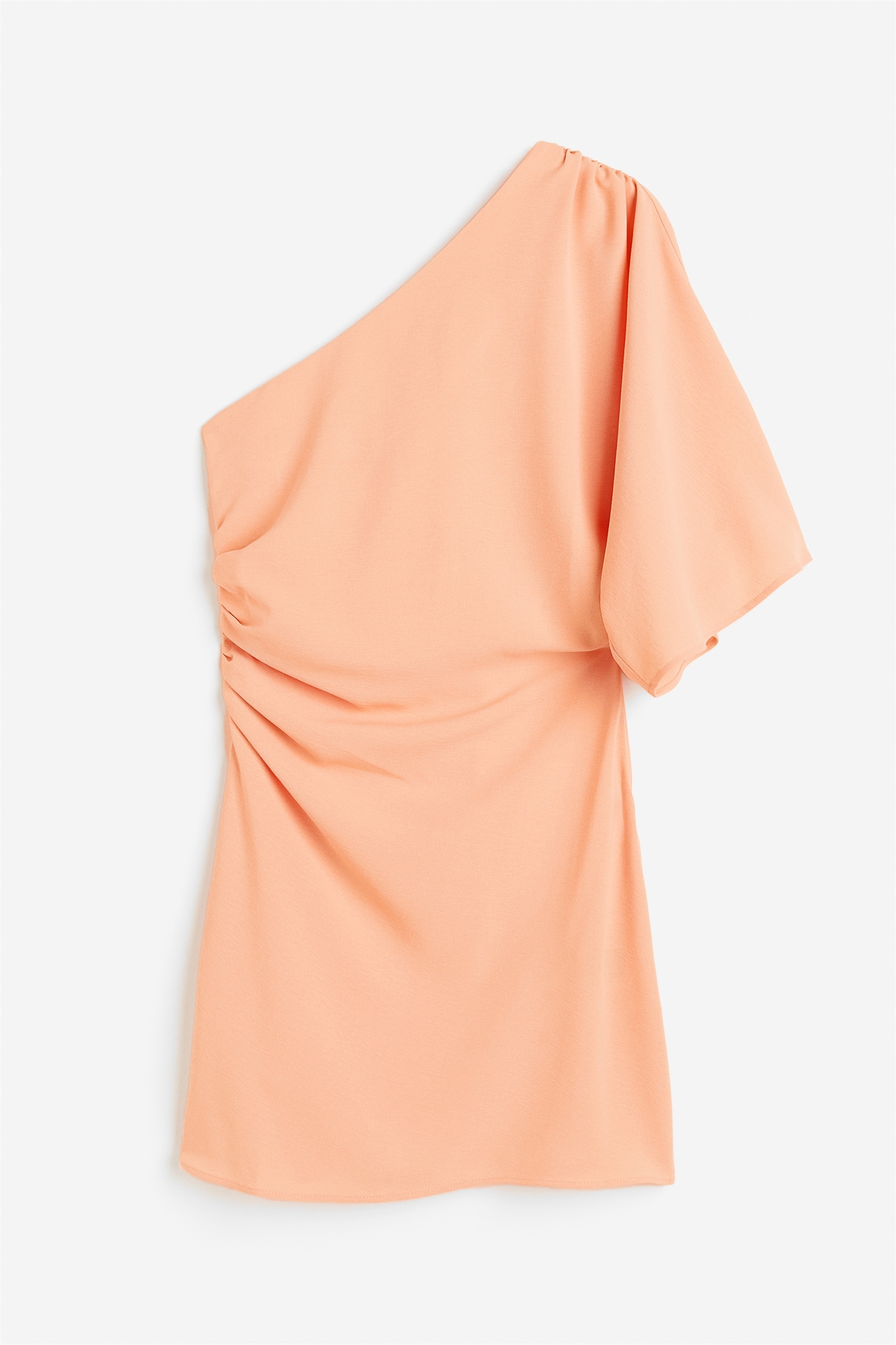 Короткое приталенное платье на одно плечо из тканого материала с асимметричным вырезом и одним коротким рукавом. Сборки на плечах и на талии с одной стороны создают эффект легкой драпировки. Потайная застежка-молния с одной стороны. Без отделки.