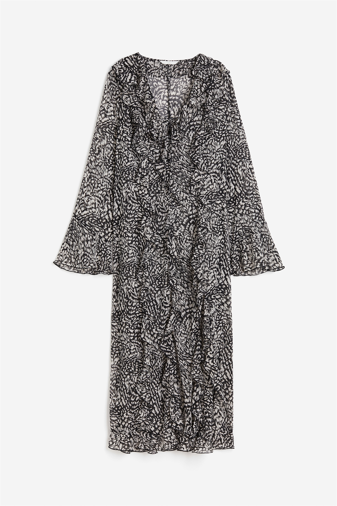 Платье длиной до щиколоток из прозрачного крепа с глубоким V-образным вырезом и завязками на спагетти по центру бюста. Длинные рукава с расклешенными манжетами и воланами вокруг выреза, спереди и по подолу. Разрез с одной стороны спереди. Без подкладки.