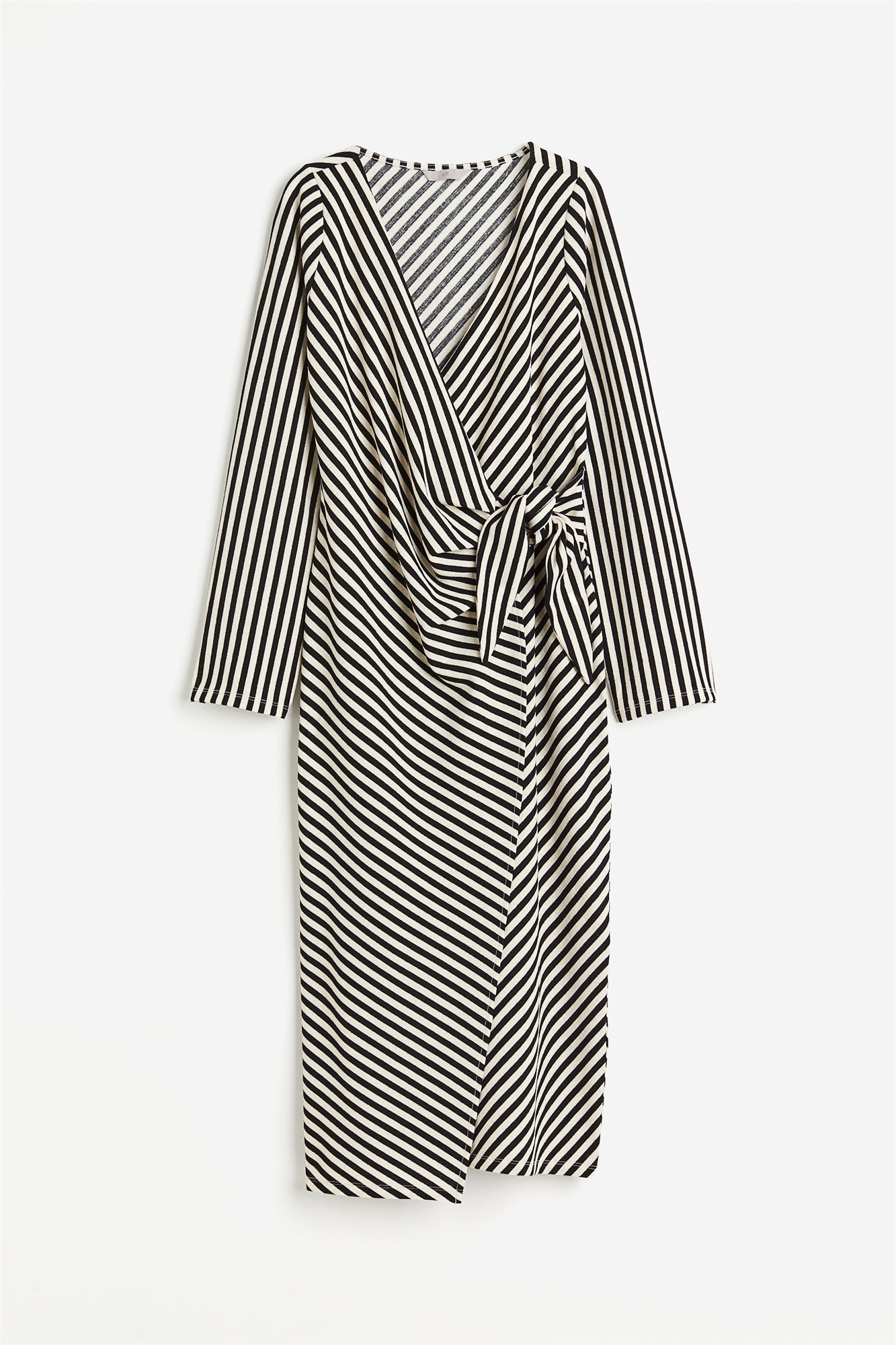Платье длиной до колена с длинными рукавами из фактурного джерси с V-образным вырезом горловины и облегающим передом с широкими завязками с одной стороны и потайной пуговицей с другой. Мягкая драпировка спереди на талии.