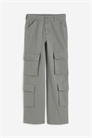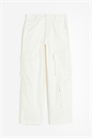 Брюки-карго из хлопковой саржи с высокой талией, застежкой на молнию и пуговицу, диагональными боковыми карманами и открытыми задними карманами. Прямые ноги с накладными карманами со скрытой застежкой на крючок и петлю.