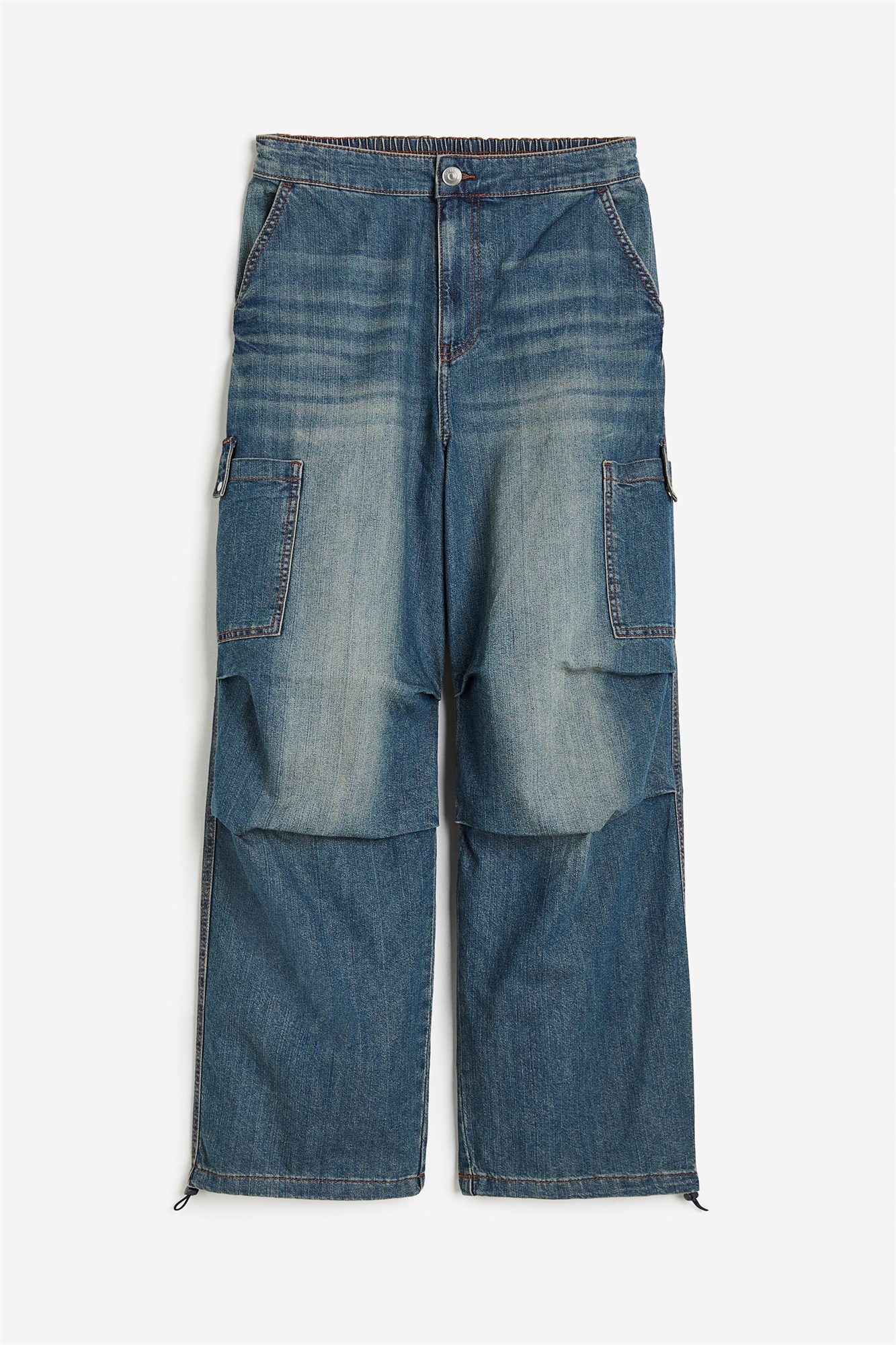 Свободные брюки из жесткого денима с эластичной вставкой сзади на талии, ширинкой на молнии и пуговицей. Диагональные боковые карманы, задний карман с клапаном и открытые карманы на ногах с вкладкой и кнопкой. Ноги со складками по бокам коленей для создания дополнительной ширины. Эластичный шнурок с ограничителем на подоле.