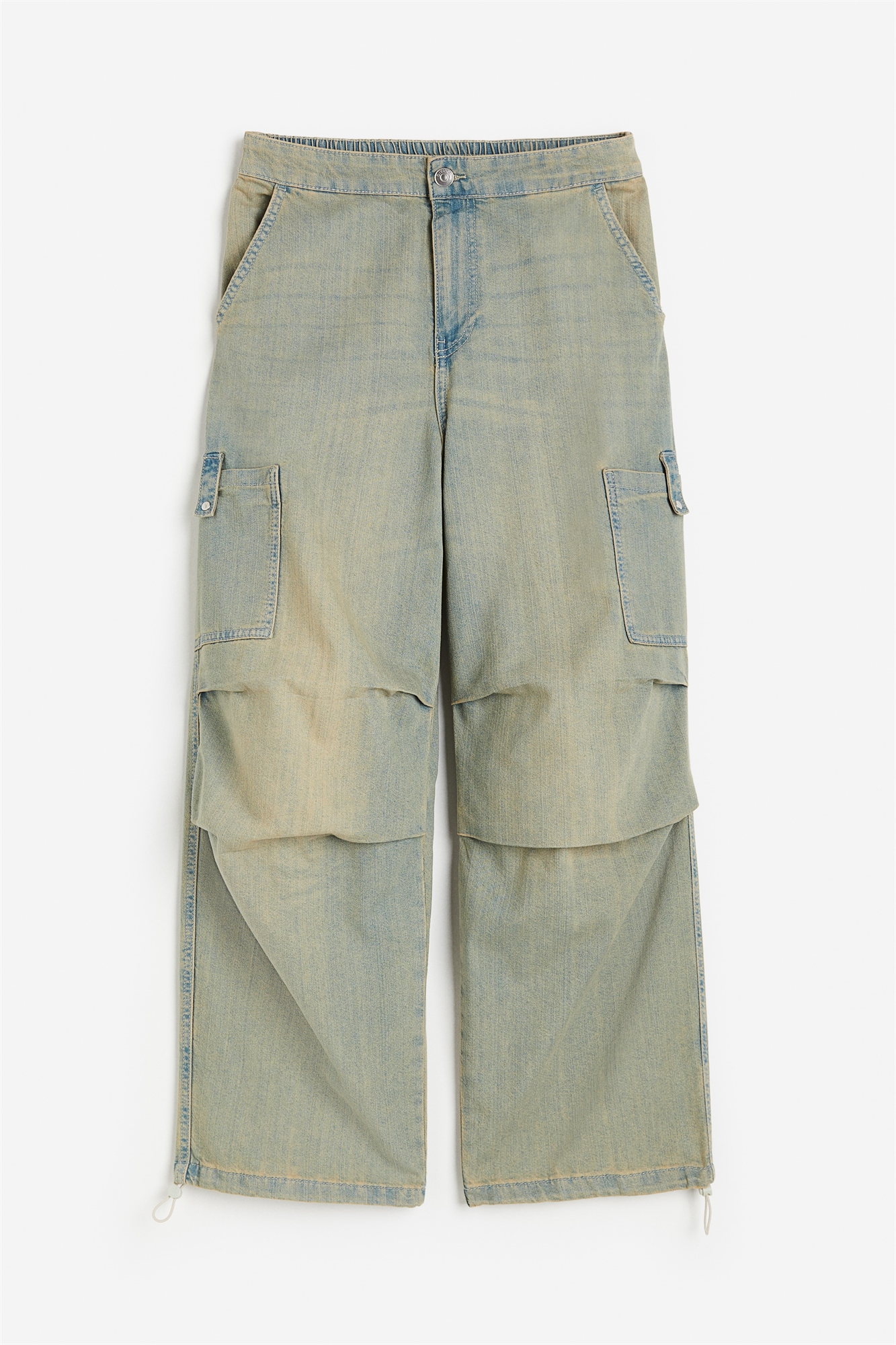 Свободные брюки из жесткого денима с эластичной вставкой сзади на талии, ширинкой на молнии и пуговицей. Диагональные боковые карманы, задний карман с клапаном и открытые карманы на ногах с вкладкой и кнопкой. Ноги со складками по бокам коленей для создания дополнительной ширины. Эластичный шнурок с ограничителем на подоле.