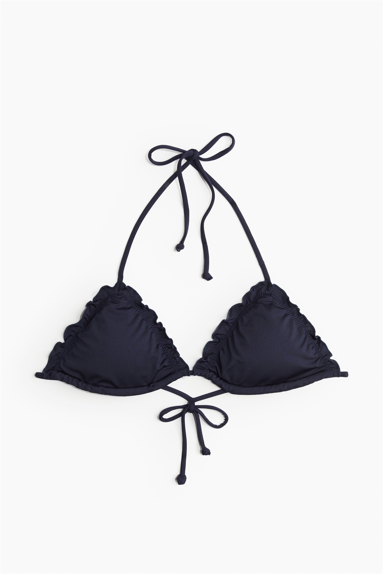 Треугольный бикини на подкладке, без проводов, с оверлочными краями и чашечками со съемными вкладышами, которые формируют бюст и обеспечивают хорошую поддержку. Завязки сзади и на шее.