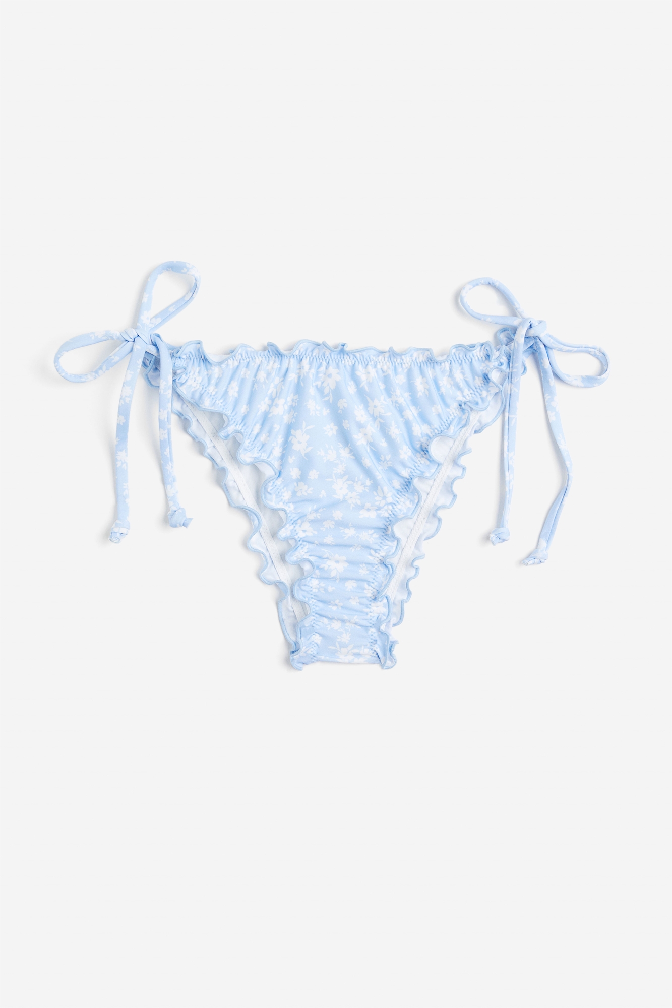 Трусы-бикини на подкладке с оверлочными краями. Заниженная талия, завязки по бокам, сборчатый шов на попе и высокий разрез сзади.