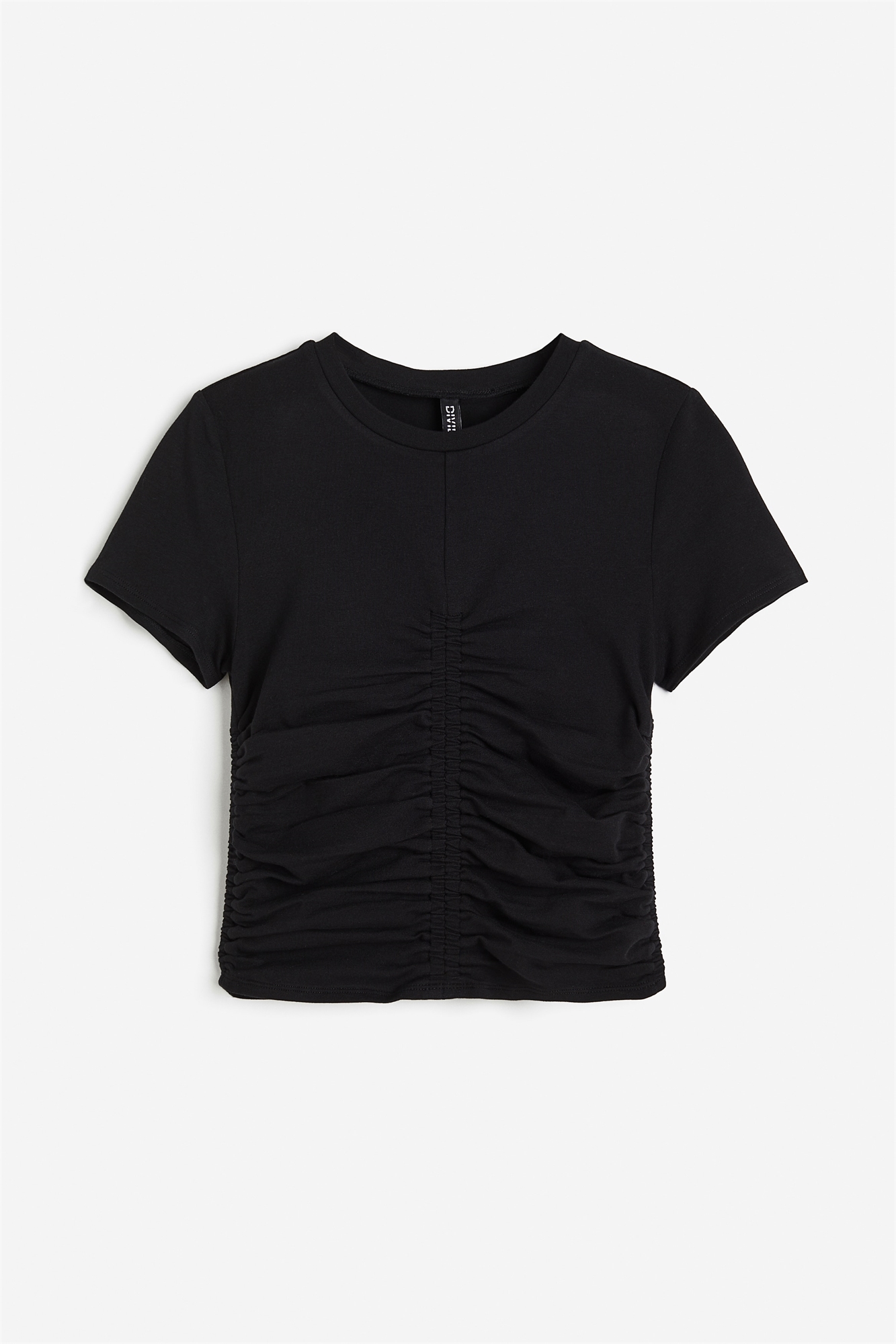 Короткая, облегающая фигуру футболка из мягкого хлопкового джерси с круглым вырезом и короткими рукавами. Сборчатые швы спереди, сзади и по бокам создают эффект легкой драпировки.