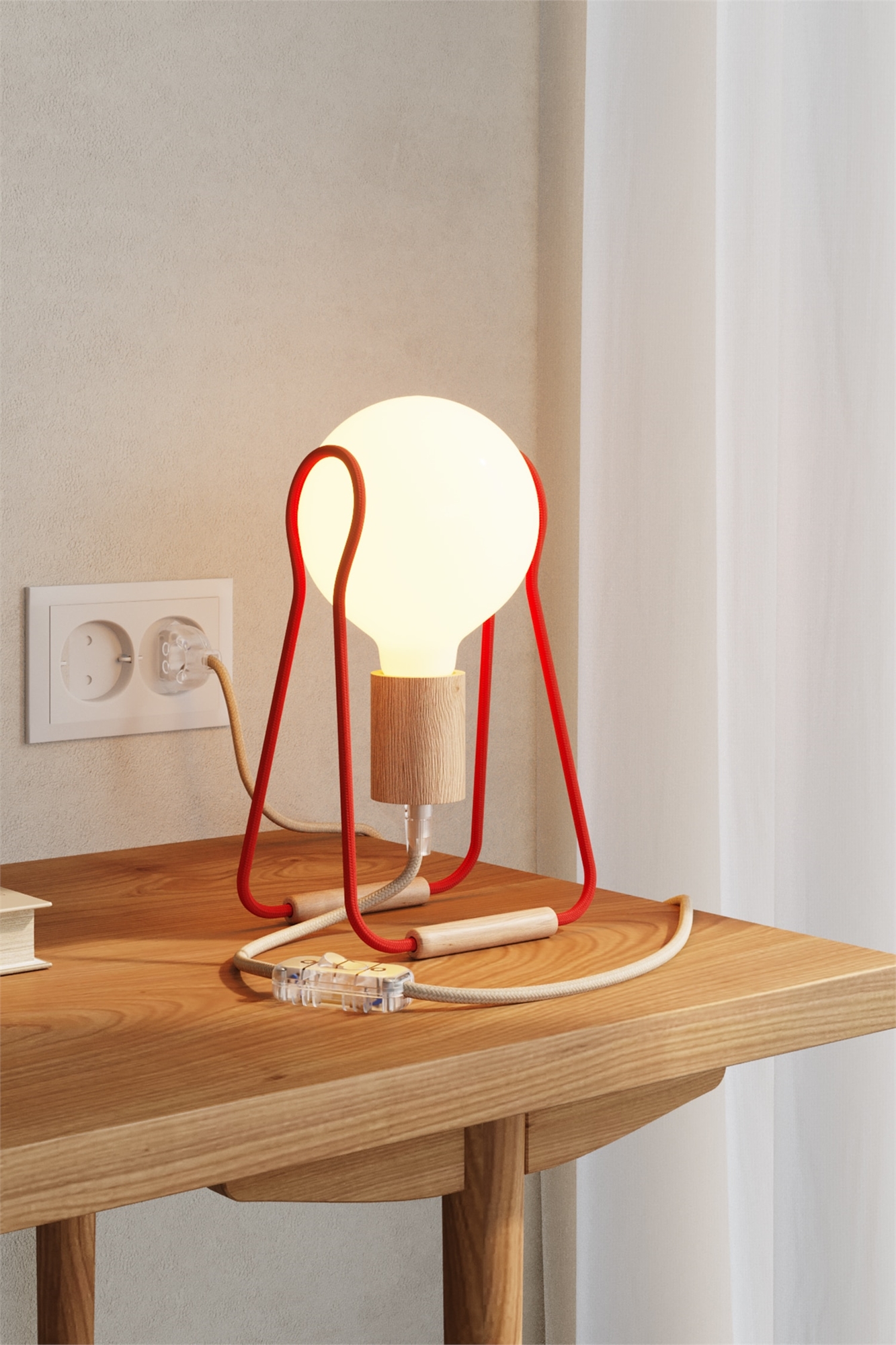 Металлическая настольная лампа с красным текстильным покрытием с деревянными ножками и другими деревянными элементами, современный дизайн. Текстильный кабель с пластиковым промежуточным выключателем с разъемом E27. В комплекте молочная лампочка 7W 806Lm. Высота стойки в форме кронштейна 24,5 см. Длина кабеля 200 см.
