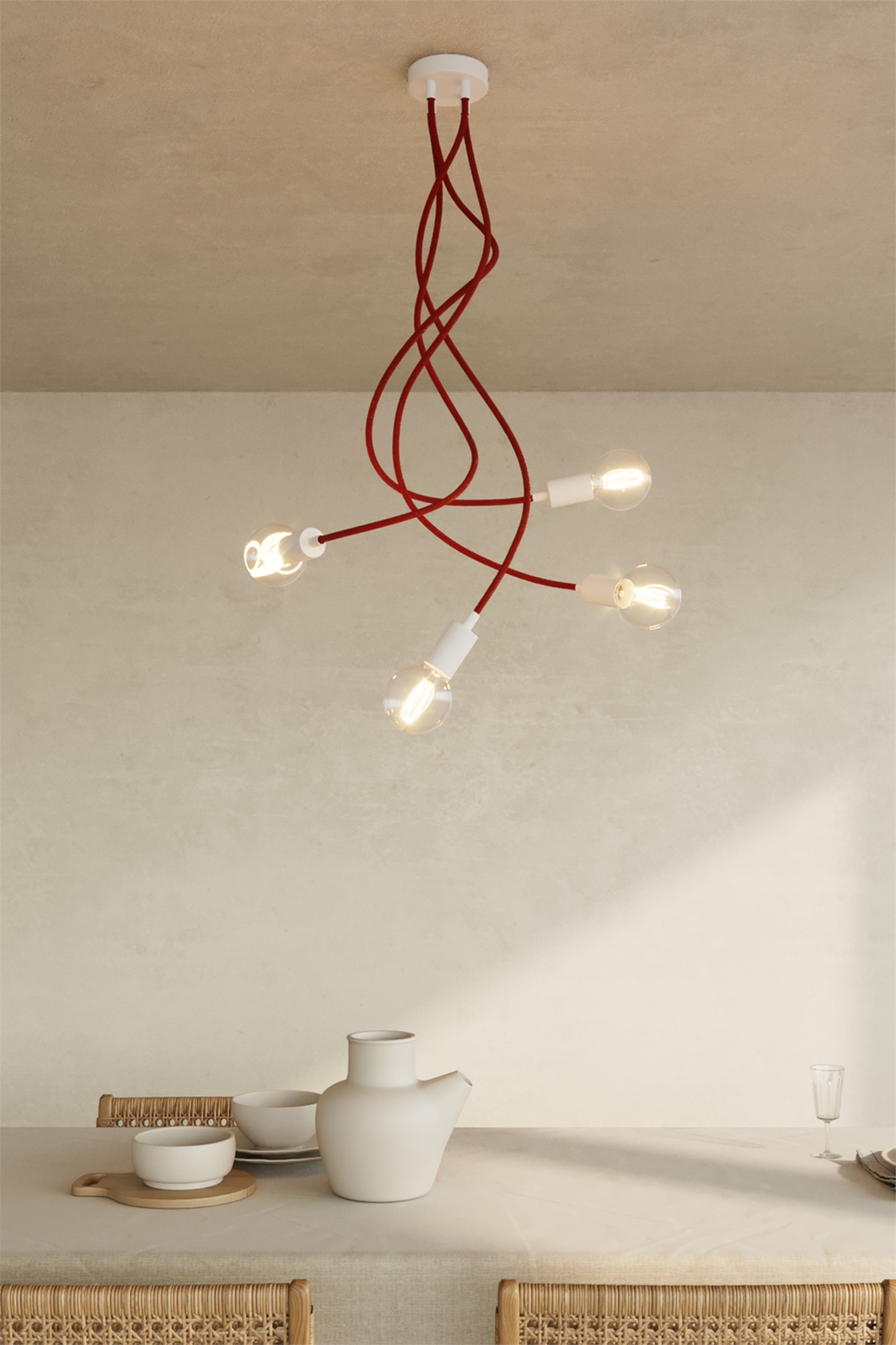 Потолочный светильник с гибкими кабельными трубками, которые можно использовать для регулировки ламп в нужном положении. Кабельные трубки с красной текстильной оболочкой и металлическими концами в белом исполнении. Патрон для лампы с разъемом E27. Лампочки в комплекте 4,9W 400Lm. Диаметр козырька 12 см. Длина кабельных трубок 90 см.