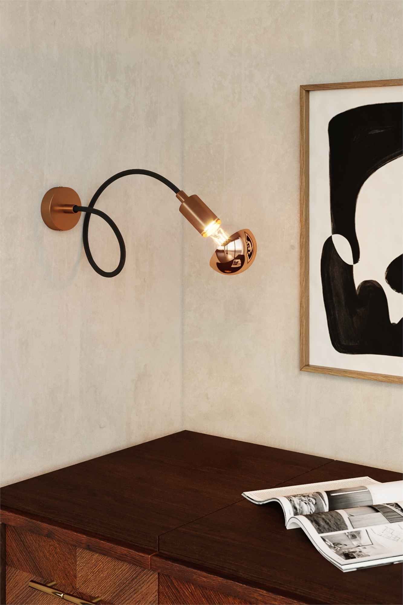 Настенный или потолочный светильник с современным дизайном. Гибкая трубка кабеля, с помощью которой можно перемещать светильник в нужное положение. Текстильный кабель. Патрон с разъемом E27. Лампочка с металлическим отражателем в комплекте 7W 730Lm. Диаметр основания 8,3 см. Длина кабельной трубки 60 см.
