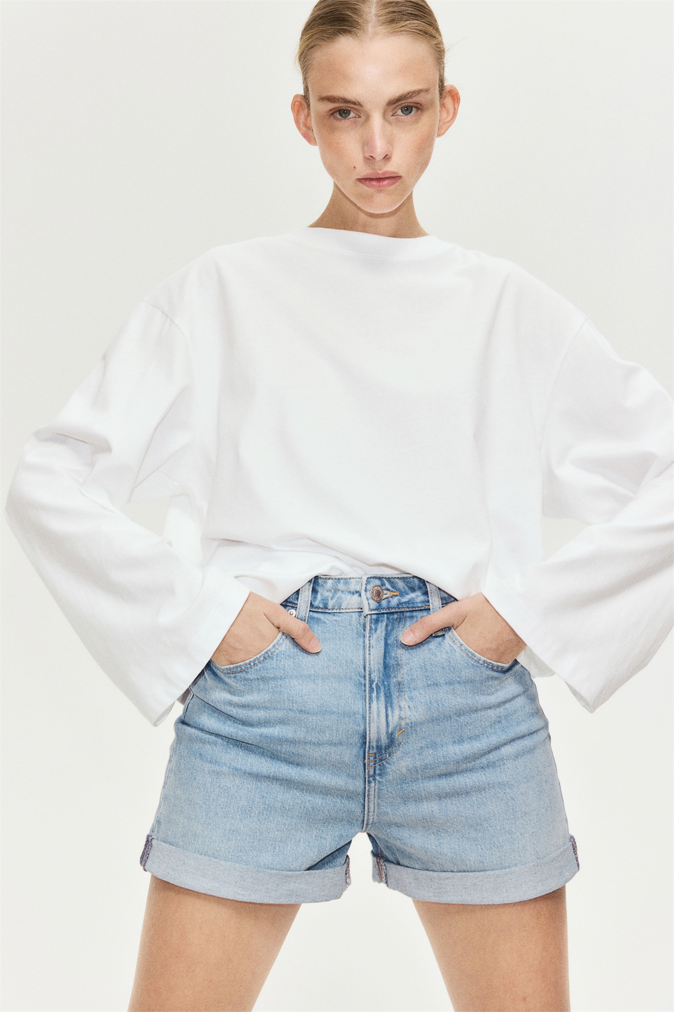 Шорты с 5 карманами из хлопкового денима, слегка тянущегося для большей легкости движений. Завышенная талия, ширинка на молнии и пуговице. Пришитые подвороты на подоле.