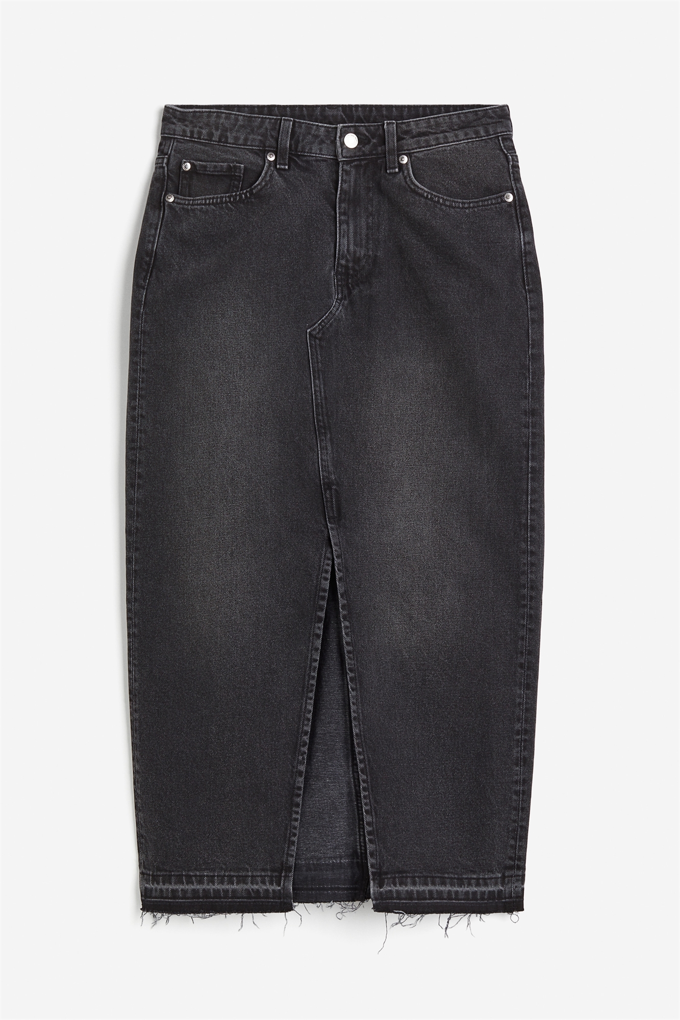 Длинная юбка с 5 карманами из жесткого хлопкового денима. Высокая талия, застежка на молнию и пуговицу, необработанный подол с высоким разрезом спереди.
