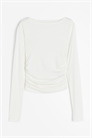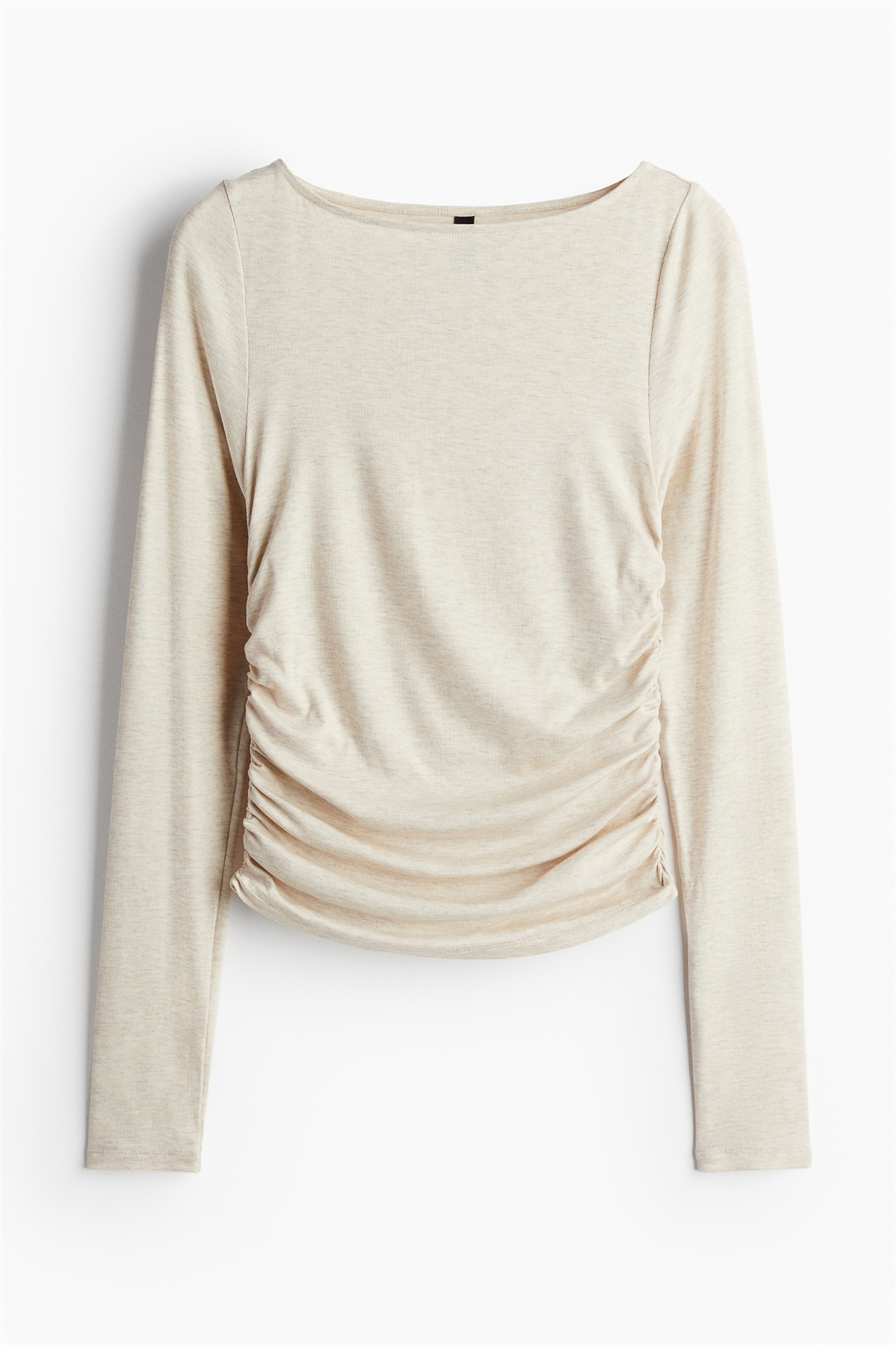 Короткий приталенный топ из мягкого джерси с широким вырезом и удлиненными рукавами. Боковые швы со сборками создают эффект легкой драпировки.