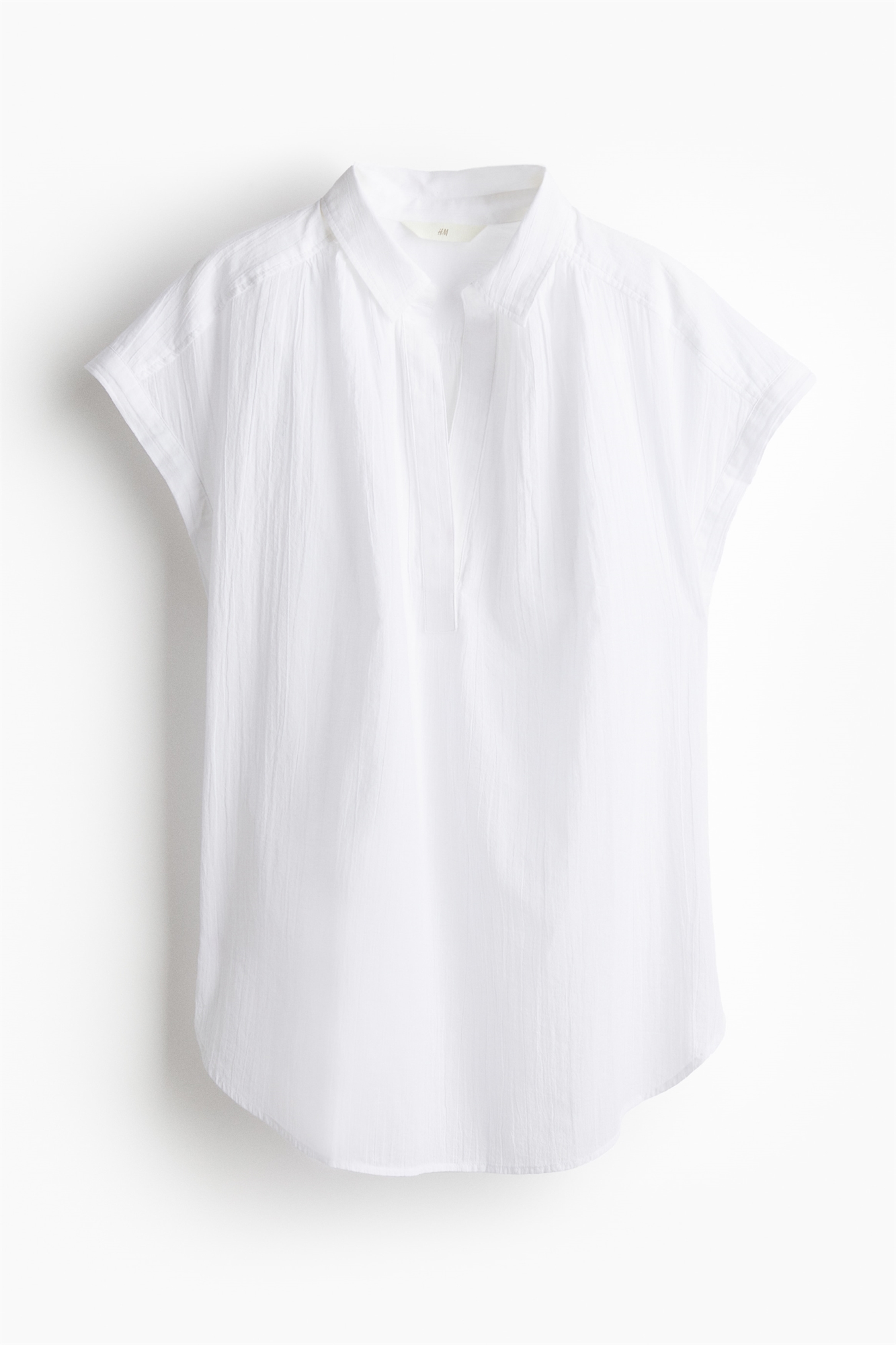 Блузка из воздушной хлопковой ткани. Свободный крой с воротником и V-образной проймой спереди. Рукава-капельки и спинка со складками. Закругленный подол.