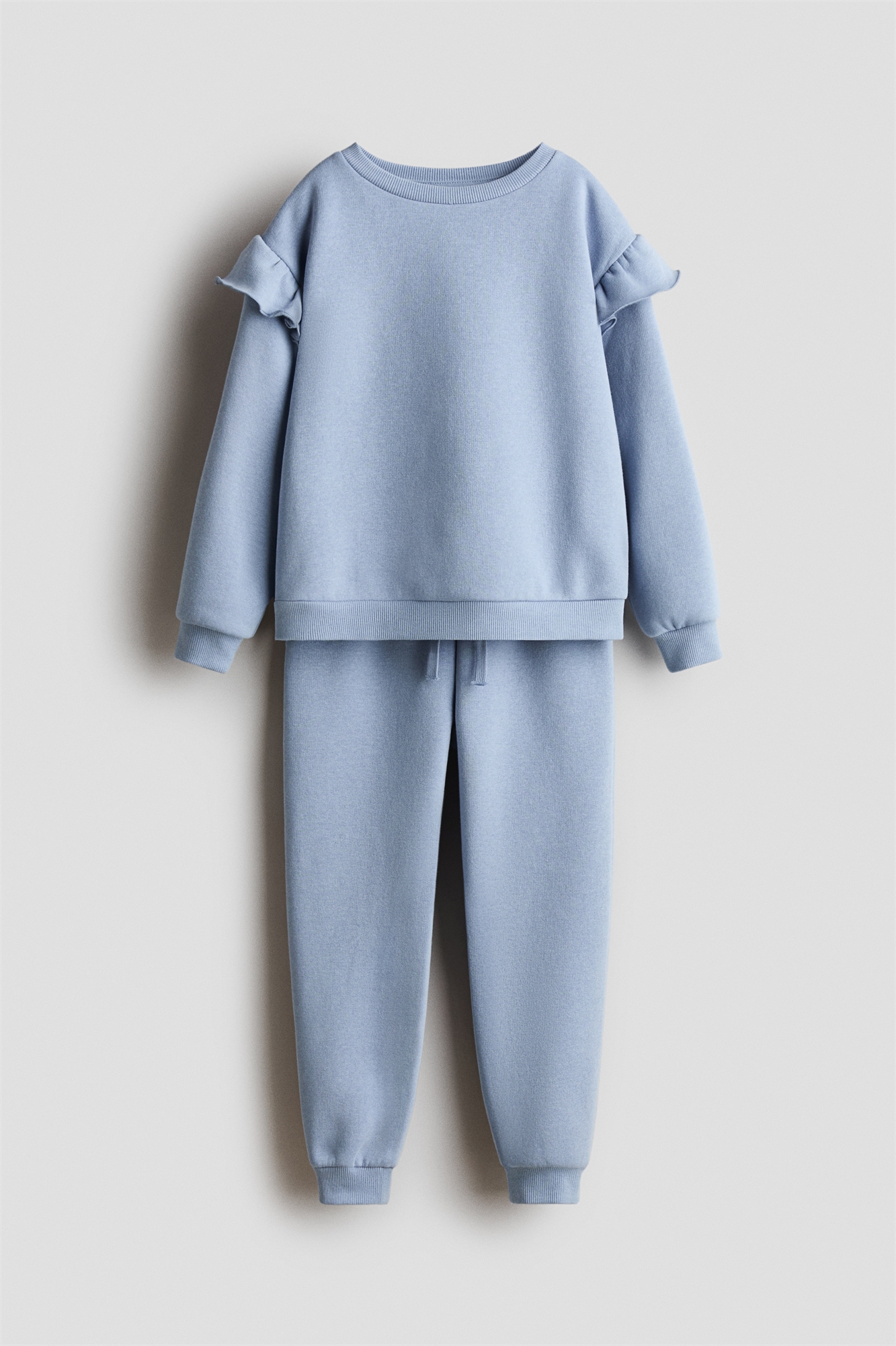 Комплект из топа и джоггеров из толстовки с мягкой ворсистой внутренней стороной. Топ с длинными рукавами, круглым вырезом с ребристой отделкой, спущенными плечами с оборкой, длинными рукавами и окантовкой на манжетах и подоле. Джоггеры с эластичным утягивающим поясом и окантовкой по подолу.