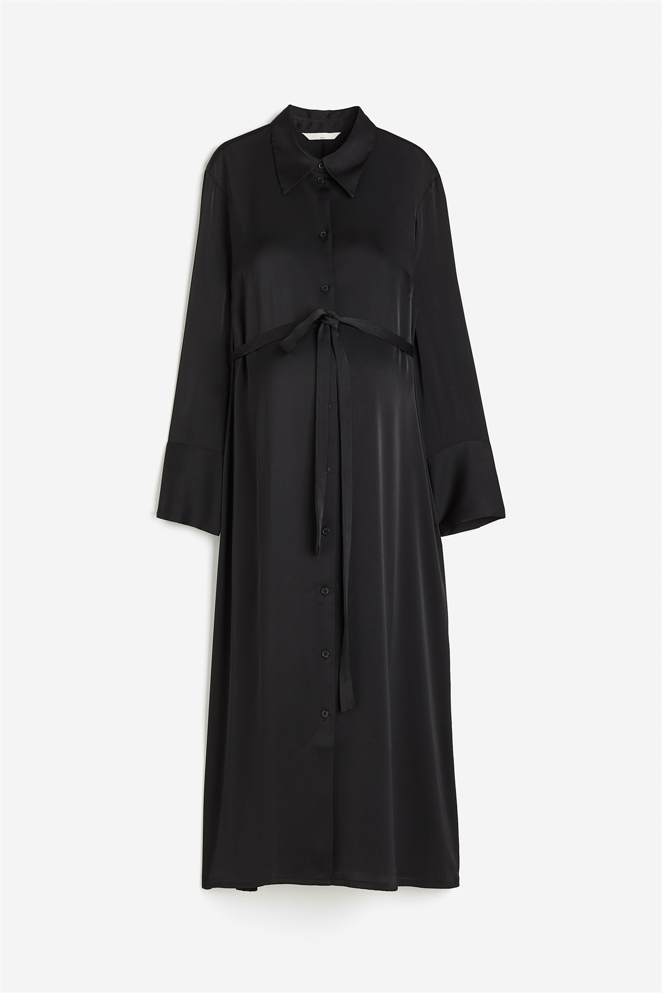Платье-рубашка длиной до колен из мягко драпирующегося атласа с воротником, пуговицами спереди и съемным поясом-завязкой на талии. Слегка спущенные плечи, длинные рукава и широкие манжеты с разрезом и пуговицей. Платье можно носить как во время, так и после беременности.