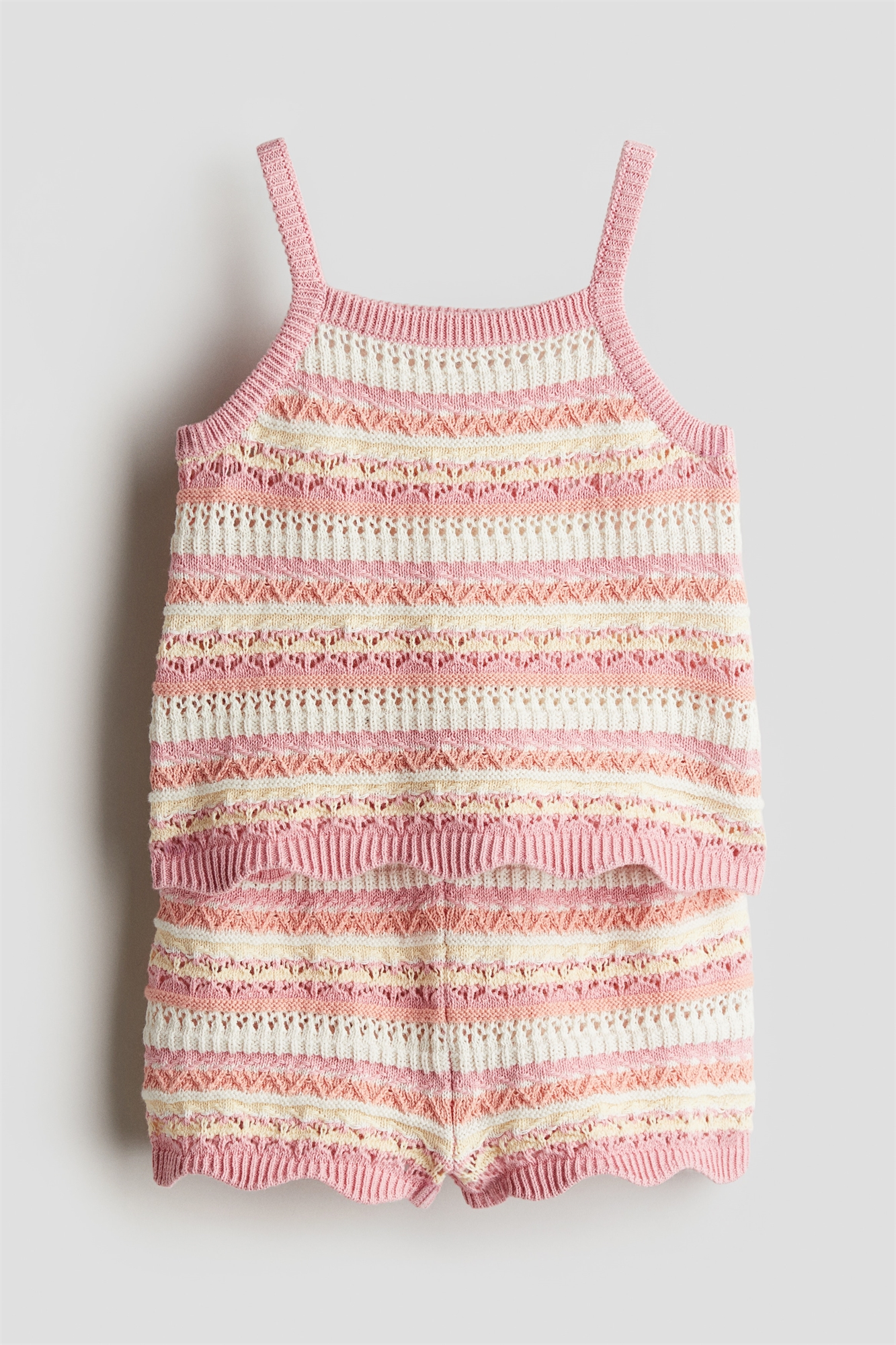 Комплект из топа на бретелях и шорт из мягкого хлопкового трикотажа с волнистыми краями. Топ на бретелях с квадратным вырезом и узкими бретелями. Шорты с регулируемым эластичным поясом.