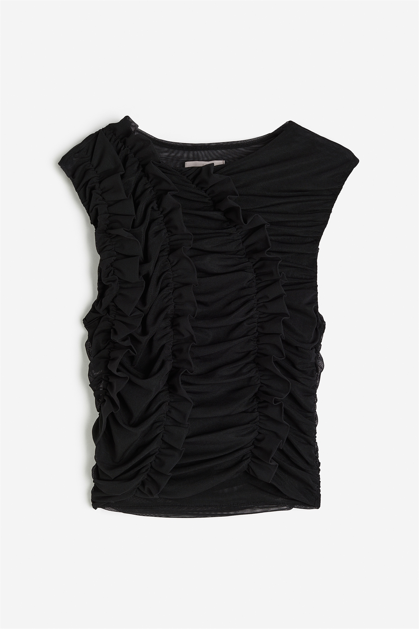 Короткий, приталенный топ без рукавов из тюля с оборками спереди. Круглый вырез и V-образные проймы.