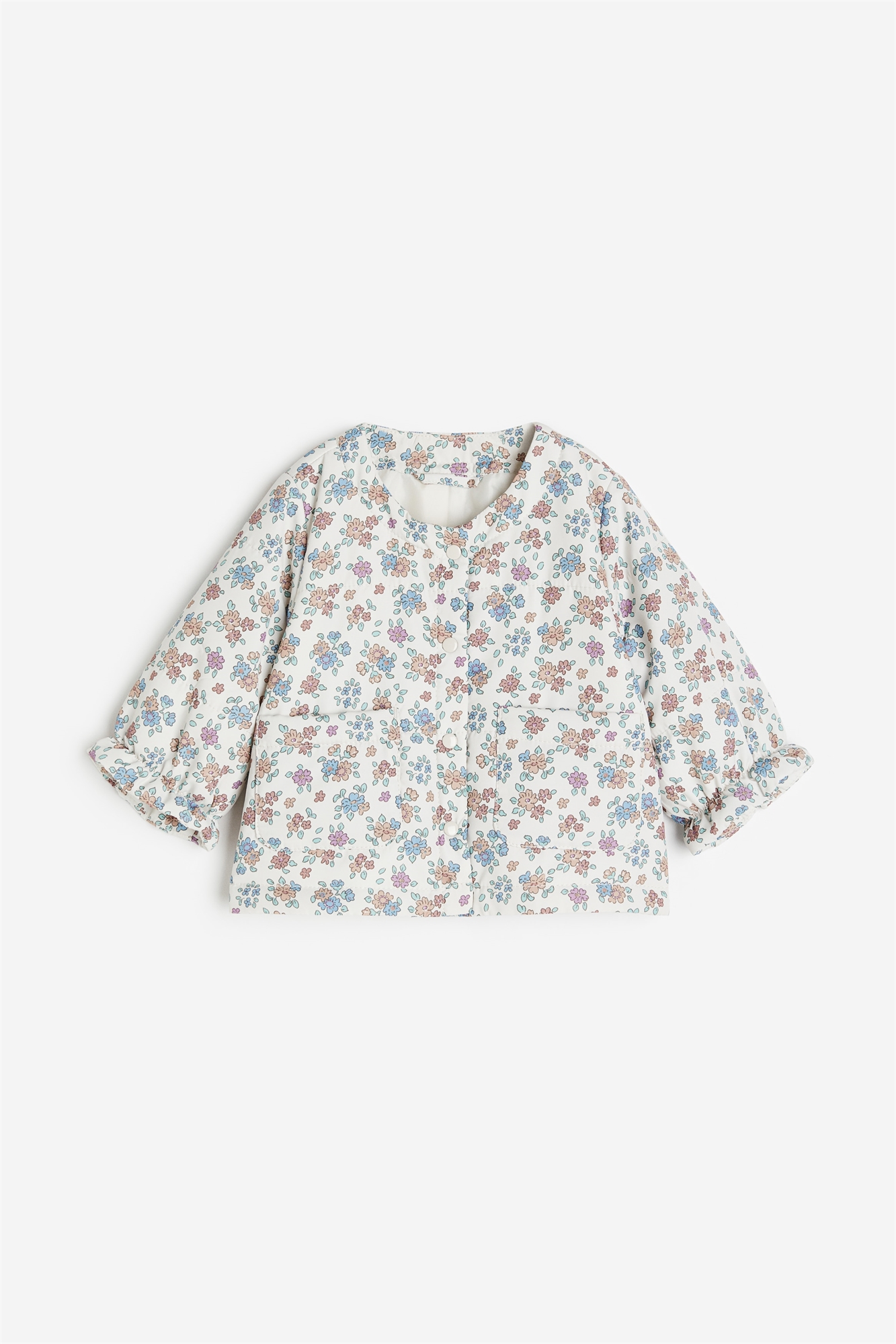 Стеганая куртка с легкой подкладкой, застежкой на кнопки спереди, накладными передними карманами и длинными рукавами с узкими эластичными манжетами и воланами на концах. На подкладке.