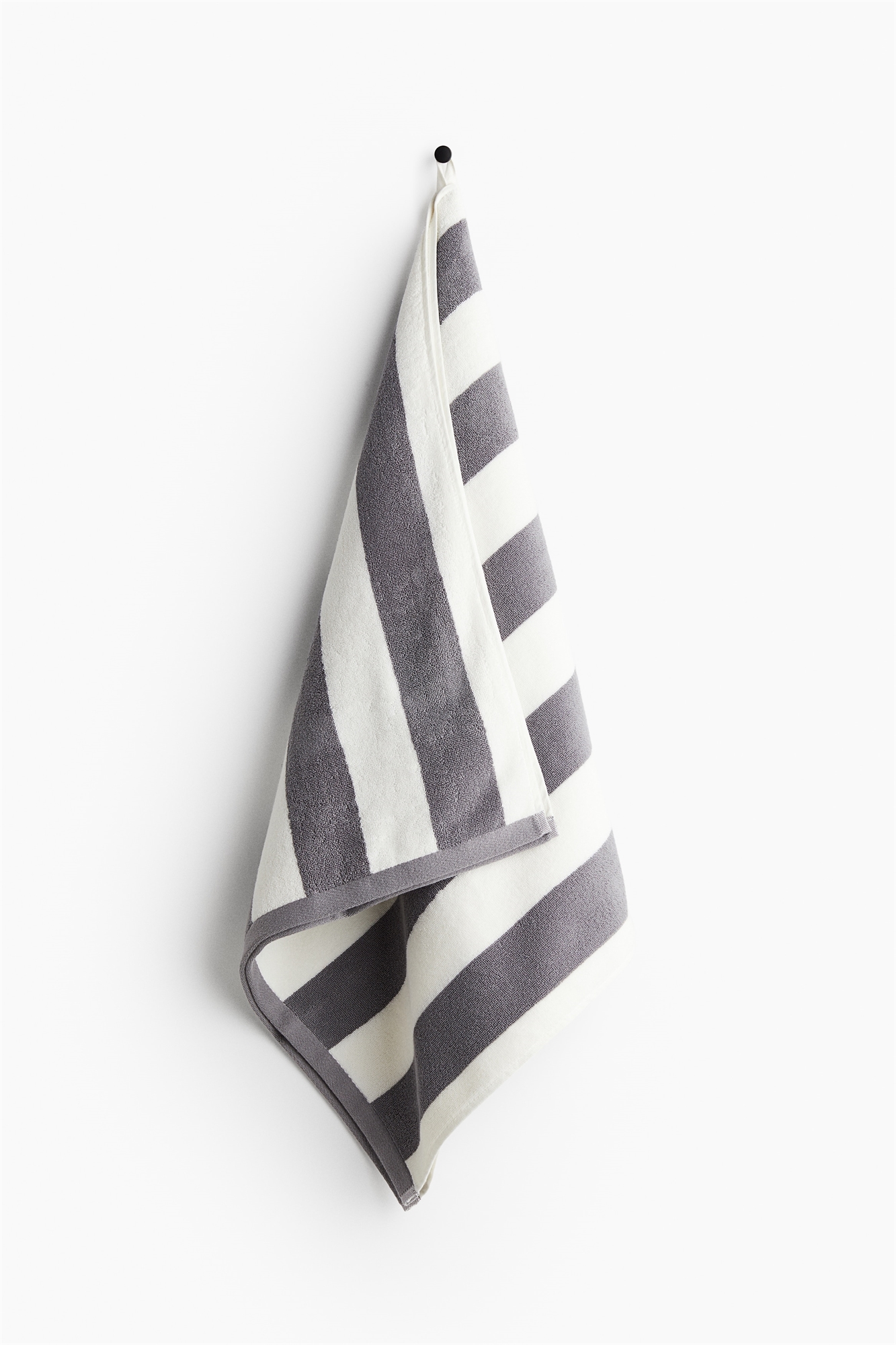 Полосатое банное полотенце из мягкой хлопковой махры с высокой степенью впитываемости. Полотенце имеет однотонную тканую кайму на коротких сторонах и может легко сочетаться друг с другом для создания индивидуального стиля дома. Петля на одной длинной стороне для подвешивания. Вес: 480 GSM. Серия включает полотенца нескольких размеров.
