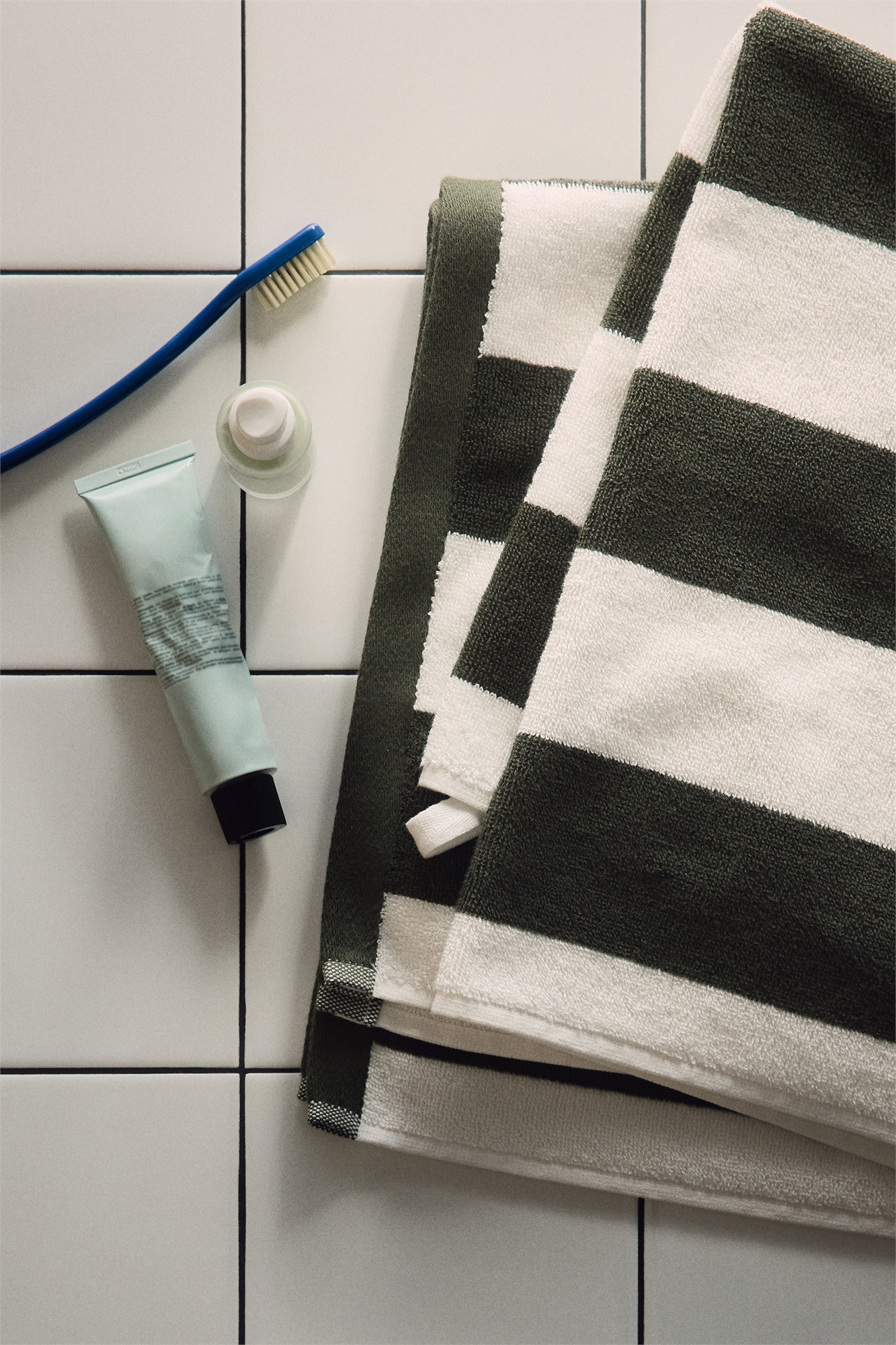Полосатое банное полотенце из мягкой хлопковой махры с высокой степенью впитываемости. Полотенце имеет однотонную тканую кайму на коротких сторонах и может легко сочетаться друг с другом для создания индивидуального стиля дома. Петля на одной длинной стороне для подвешивания. Вес: 480 GSM. Серия включает полотенца нескольких размеров.