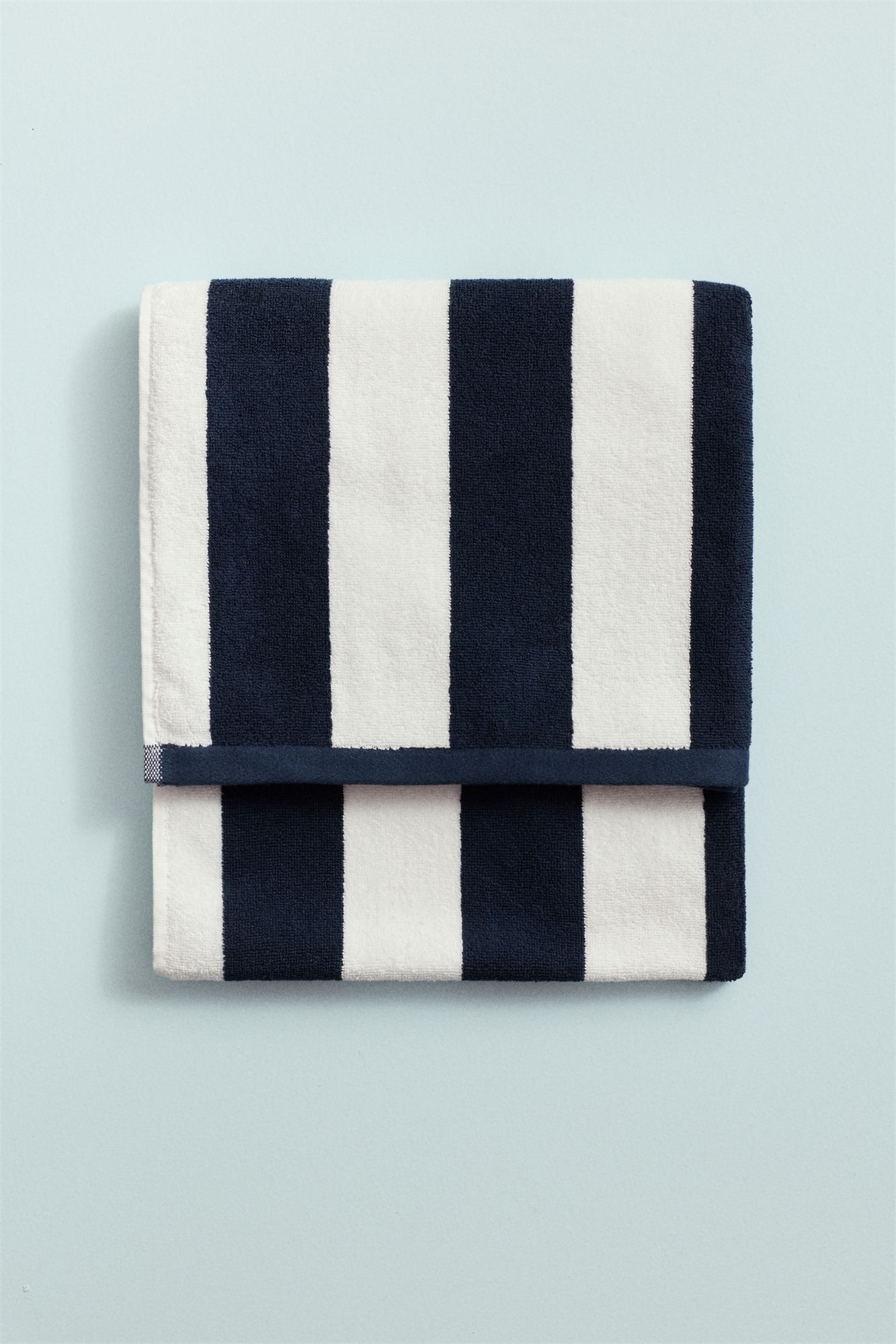 Полосатое банное полотенце из мягкой хлопковой махры с высокой степенью впитываемости. Полотенце имеет однотонную тканую кайму на коротких сторонах и может легко сочетаться друг с другом для создания индивидуального стиля дома. Петля на одной длинной стороне для подвешивания. Вес: 480 GSM. Серия включает полотенца нескольких размеров.