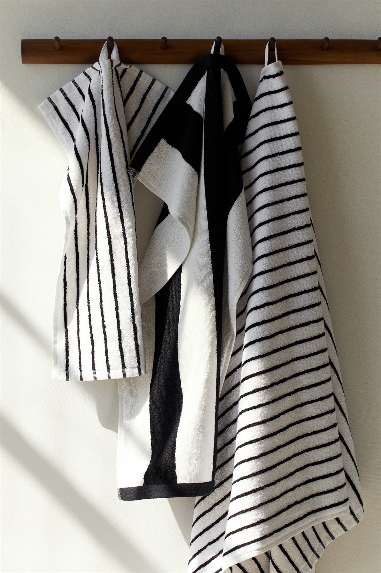 Полосатое полотенце для рук из мягкой хлопковой махры с высокой степенью впитываемости. Полотенце имеет однотонную тканую кайму на коротких сторонах, которую можно легко смешивать и сочетать для создания индивидуального стиля дома. Петля на одной короткой стороне для подвешивания. Вес: 480 GSM. Серия включает полотенца нескольких размеров.