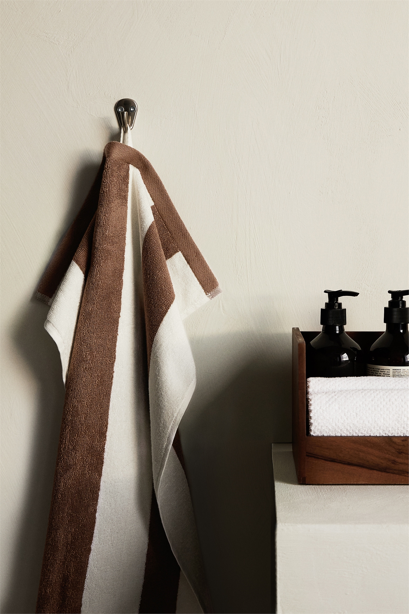 Полосатое полотенце для рук из мягкой хлопковой махры с высокой степенью впитываемости. Полотенце имеет однотонную тканую кайму на коротких сторонах, которую можно легко смешивать и сочетать для создания индивидуального стиля дома. Петля на одной короткой стороне для подвешивания. Вес: 480 GSM. Серия включает полотенца нескольких размеров.