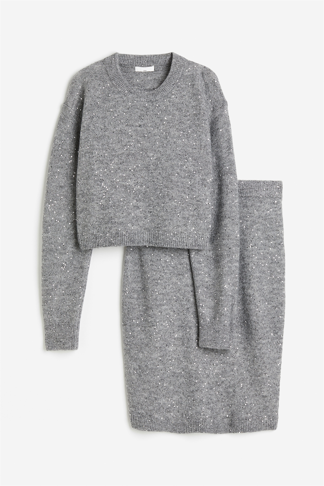 Комплект из джемпера и юбки из мягкого трикотажа. Джемпер с круглым вырезом, слегка спущенными плечами и длинными рукавами. Окантовка по вырезу горловины, манжетам и подолу. Короткая приталенная юбка с эластичной отделкой в верхней части и окантовкой по подолу.