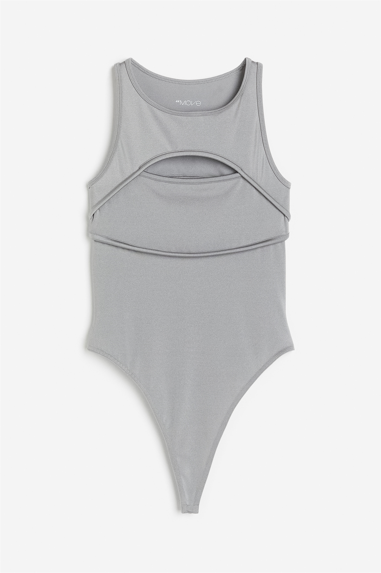 Спортивное боди-стринги без рукавов из переливающейся функциональной ткани DryMove™, которая помогает отводить влагу от кожи, сохраняя вас комфортно сухой во время движения. Круглый вырез, вырезы и отделка спереди и сзади, высокий разрез на ногах и скрытые кнопки в промежности.
