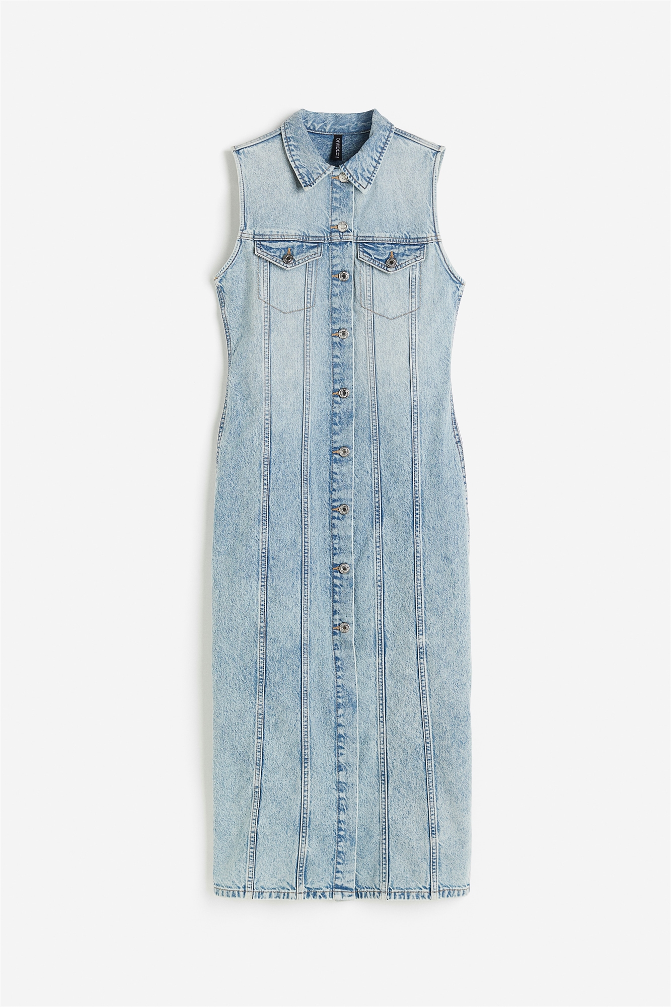 Приталенное платье без рукавов длиной до колен из прочного хлопкового денима с воротником, пуговицами спереди и ярмом сзади. Накладные нагрудные карманы с пуговицей, видимые швы спереди и сзади и разрез сзади на подоле.