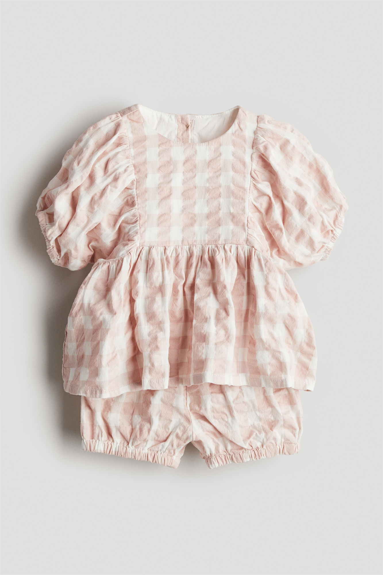 Комплект из блузки и трусиков-распашонок из воздушного хлопкового муслина с узорчатым рисунком. Блузка с круглым вырезом, застежкой на пуговицы с деревянным рисунком на задней части горловины и сборчатым швом над талией для более полного образа. Короткие объемные пышные рукава с узкими эластичными манжетами. Трусики-блумеры с закрытой регулируемой резинкой на талии и узкой резинкой вокруг ног.