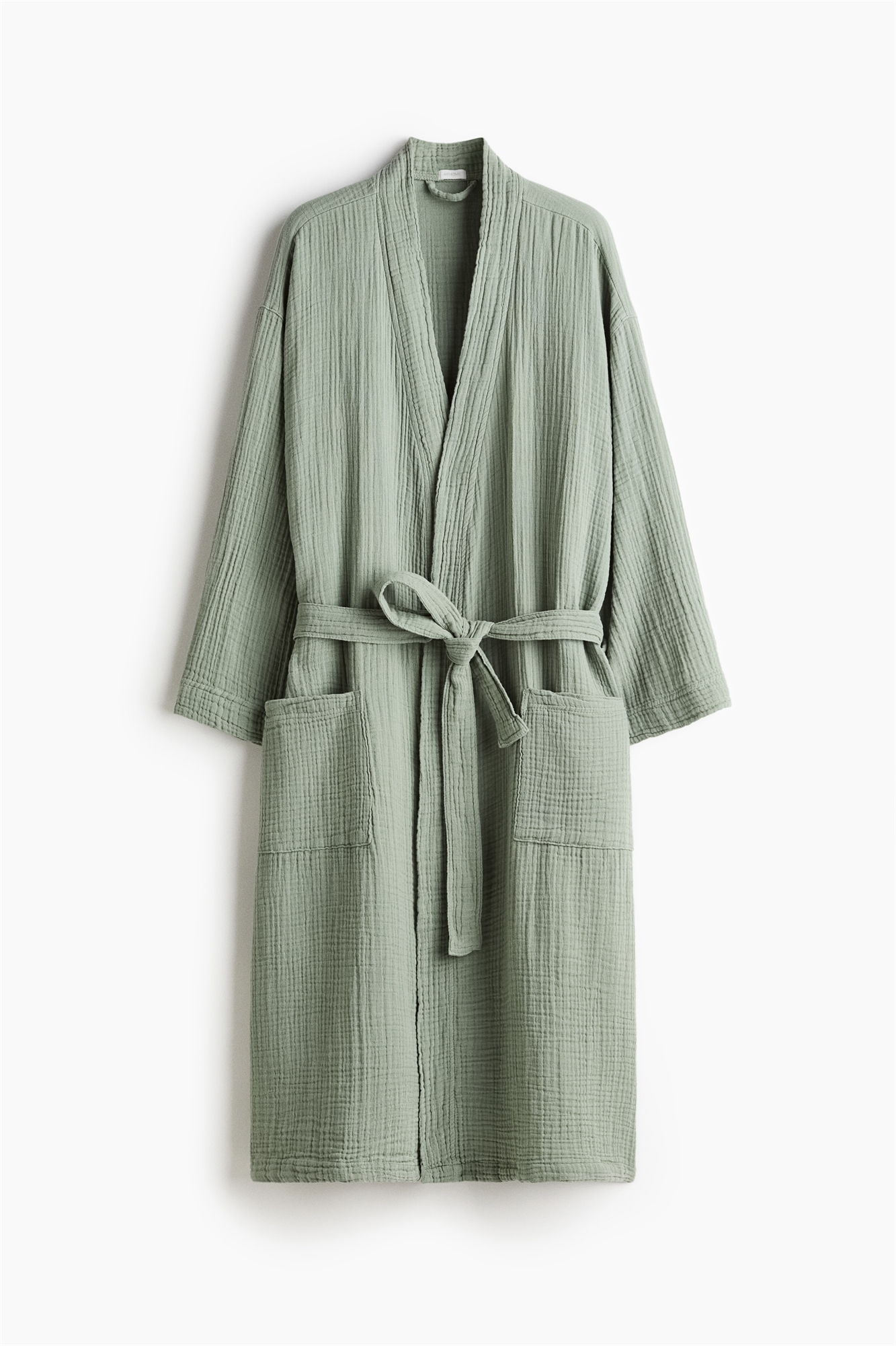 Халат из мягкого хлопкового муслина с шалевым воротником, съемным поясом-завязкой на талии и накладными карманами спереди.