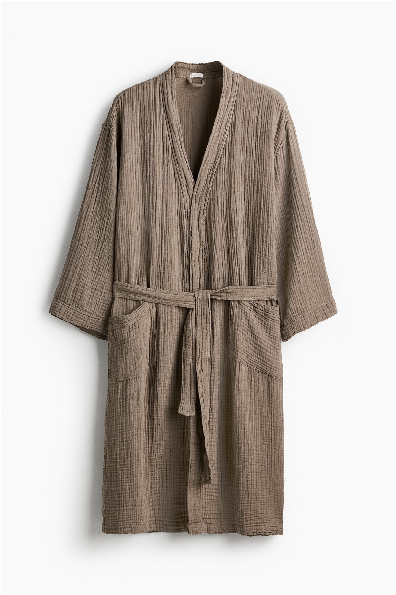 Халат из мягкого хлопкового муслина с шалевым воротником, съемным поясом-завязкой на талии и накладными карманами спереди.