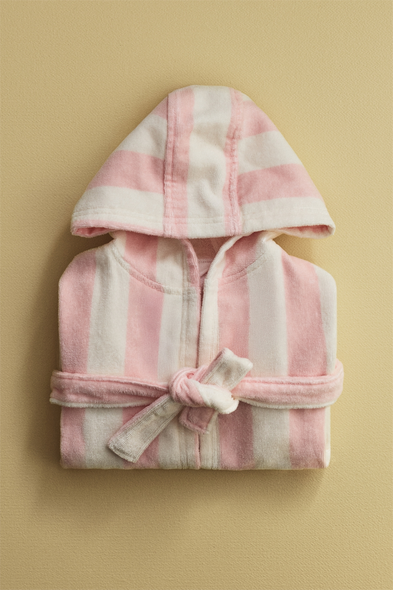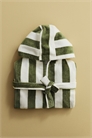 Халат с капюшоном из мягкой хлопковой махры в полоску, с большими накладными карманами спереди и поясом-завязкой на талии.