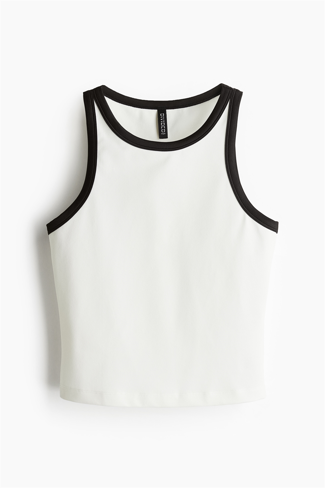 Короткий приталенный топ из ребристого трикотажа с узким вырезом в верхней части. Узкая окантовка по вырезу горловины и проймам.