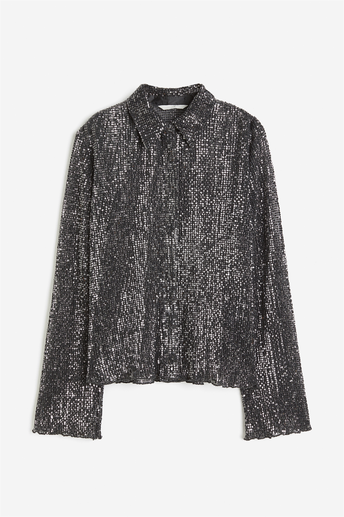 Блузка с длинными рукавами из блестящей сетки с воротником и потайными пуговицами спереди. Манжеты и подол обработаны оверлоком. Без подкладки.