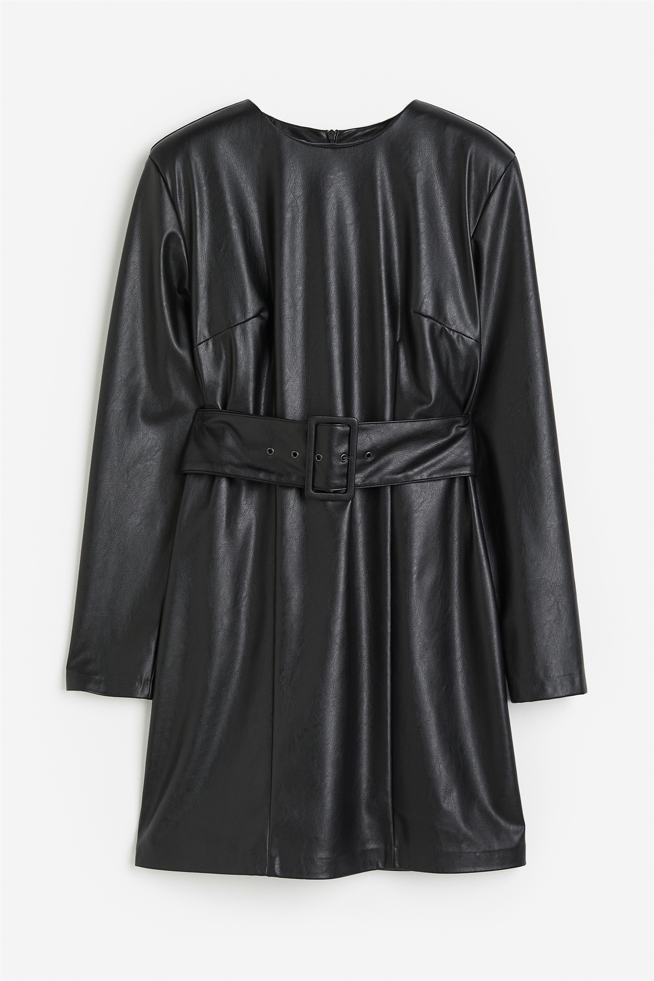 Короткое платье с круглым вырезом, острыми подплечниками и длинными рукавами. Фигурные вытачки, широкий пояс с прямоугольной пряжкой на талии и видимые швы по юбке. Скрытая застежка-молния сзади.