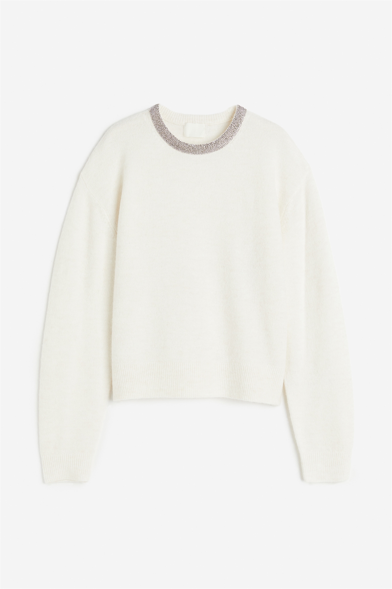 Джемпер свободного покроя из мягкого тонкого трикотажа с добавлением шерсти с круглым вырезом, украшенным стразами, спущенными плечами, длинными рукавами и завязками на манжетах и подоле.