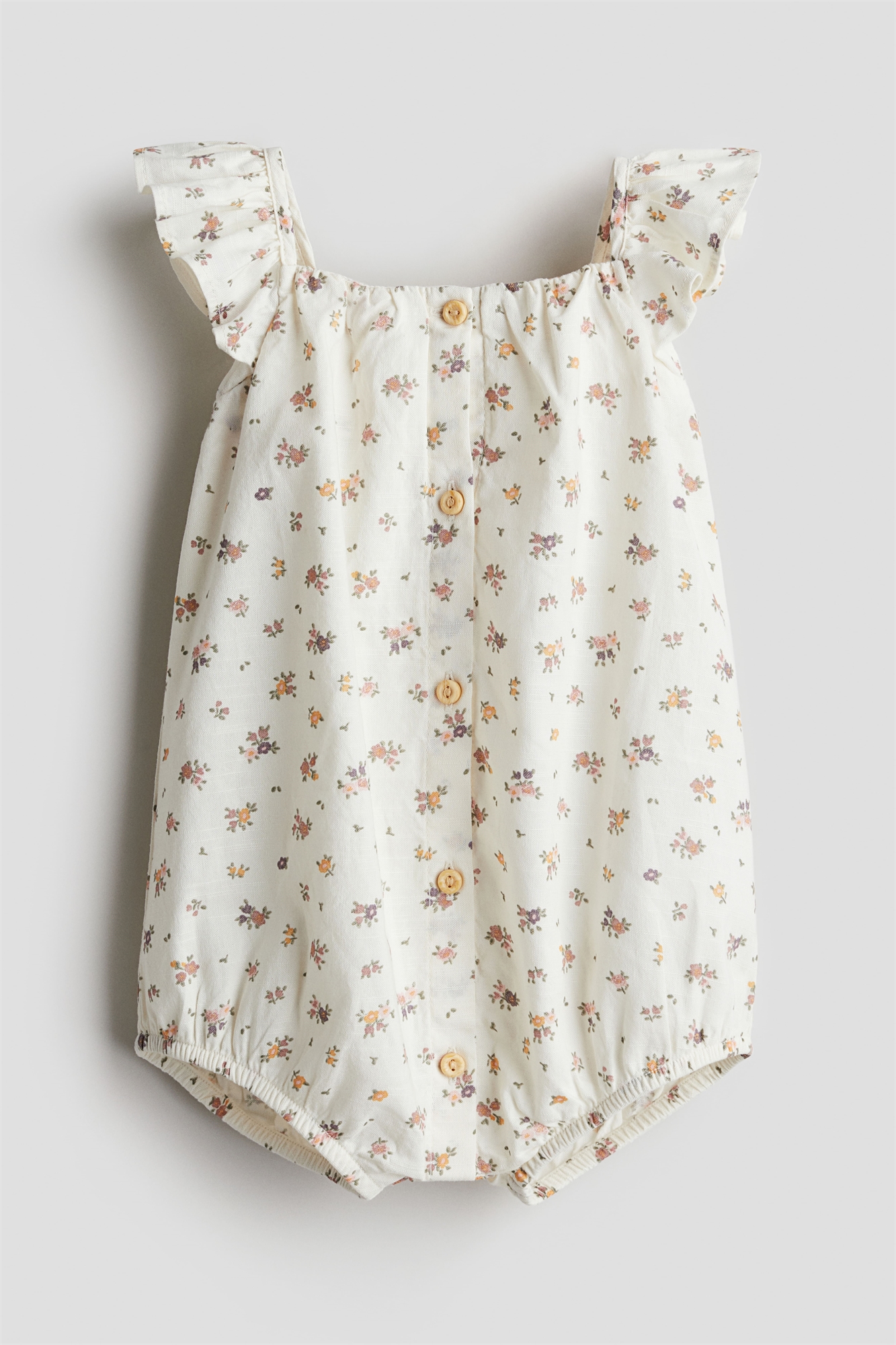 Костюм-ромпер из воздушного хлопкового полотна. Квадратный вырез с узкой резинкой, рукава-воланы, пуговицы с деревянным рисунком спереди и узкая резинка вокруг ног.