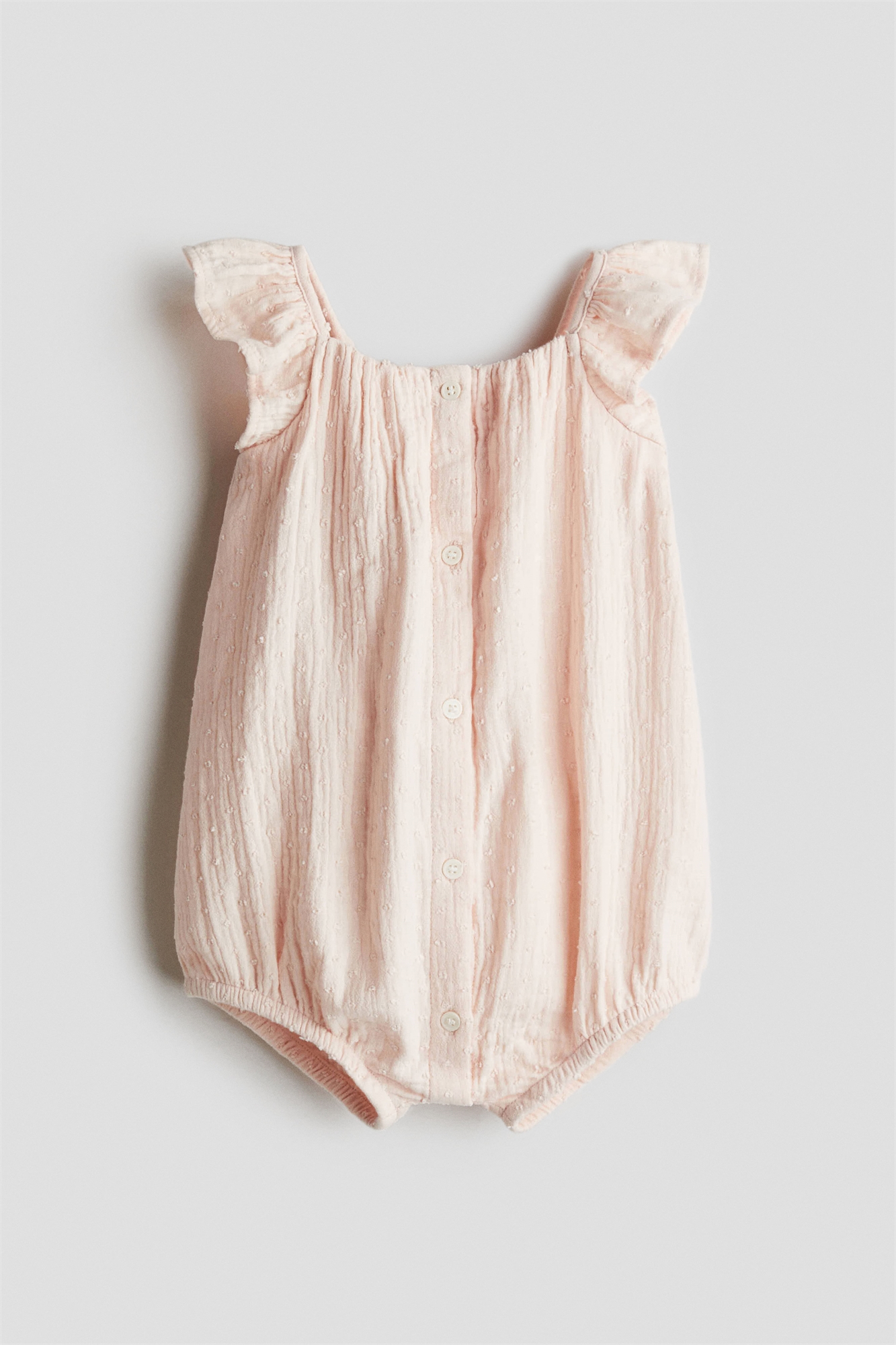 Костюм-ромпер из воздушного хлопкового полотна. Квадратный вырез с узкой резинкой, рукава-воланы, пуговицы с деревянным рисунком спереди и узкая резинка вокруг ног.