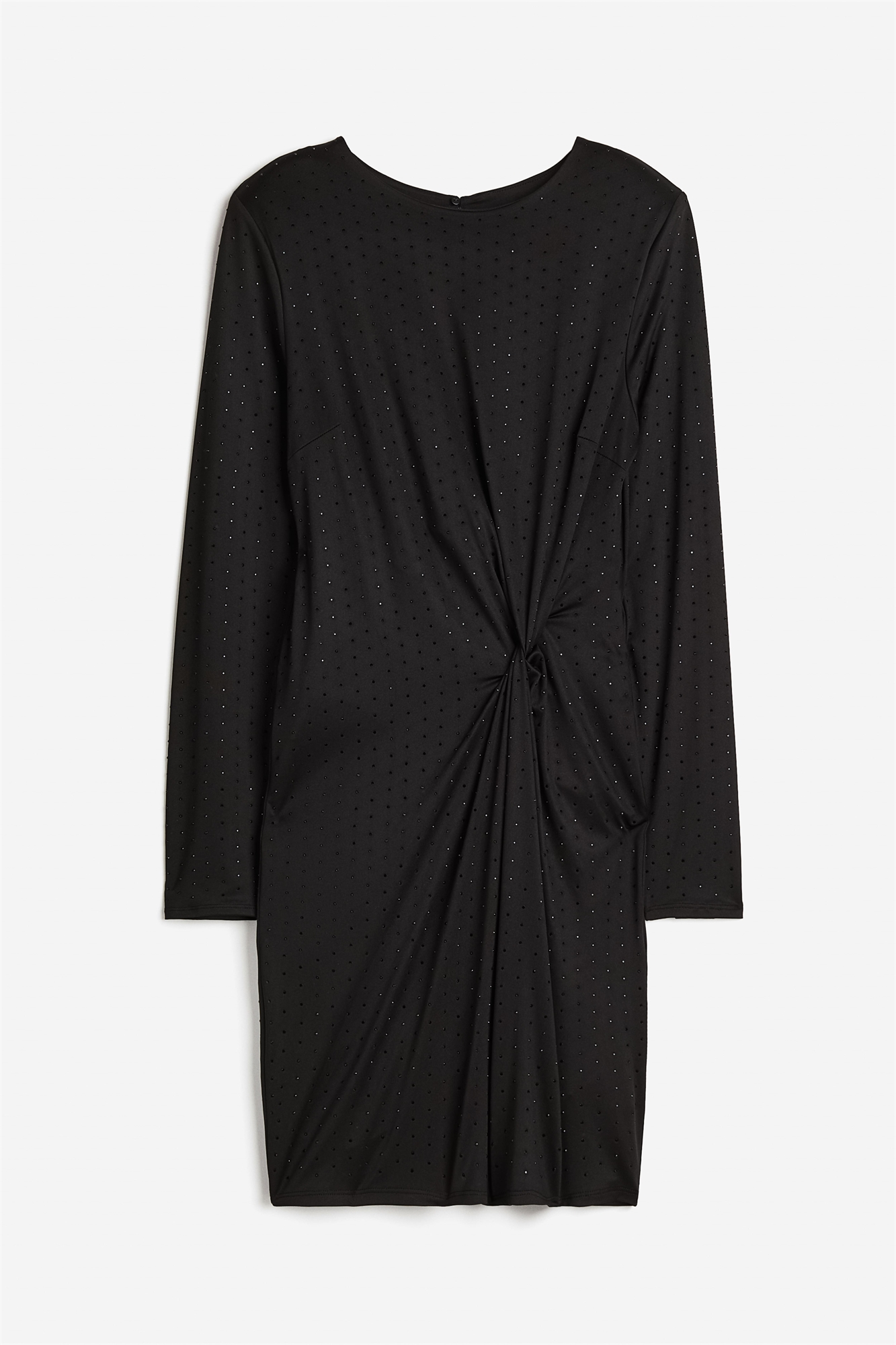 Короткое приталенное платье из мягкого джерси с круглым вырезом и прорезью для ключа с потайной пуговицей сзади на шее. Тонкие подплечники, длинные рукава и деталь в виде узла с одной стороны талии для создания эффекта легкой драпировки.