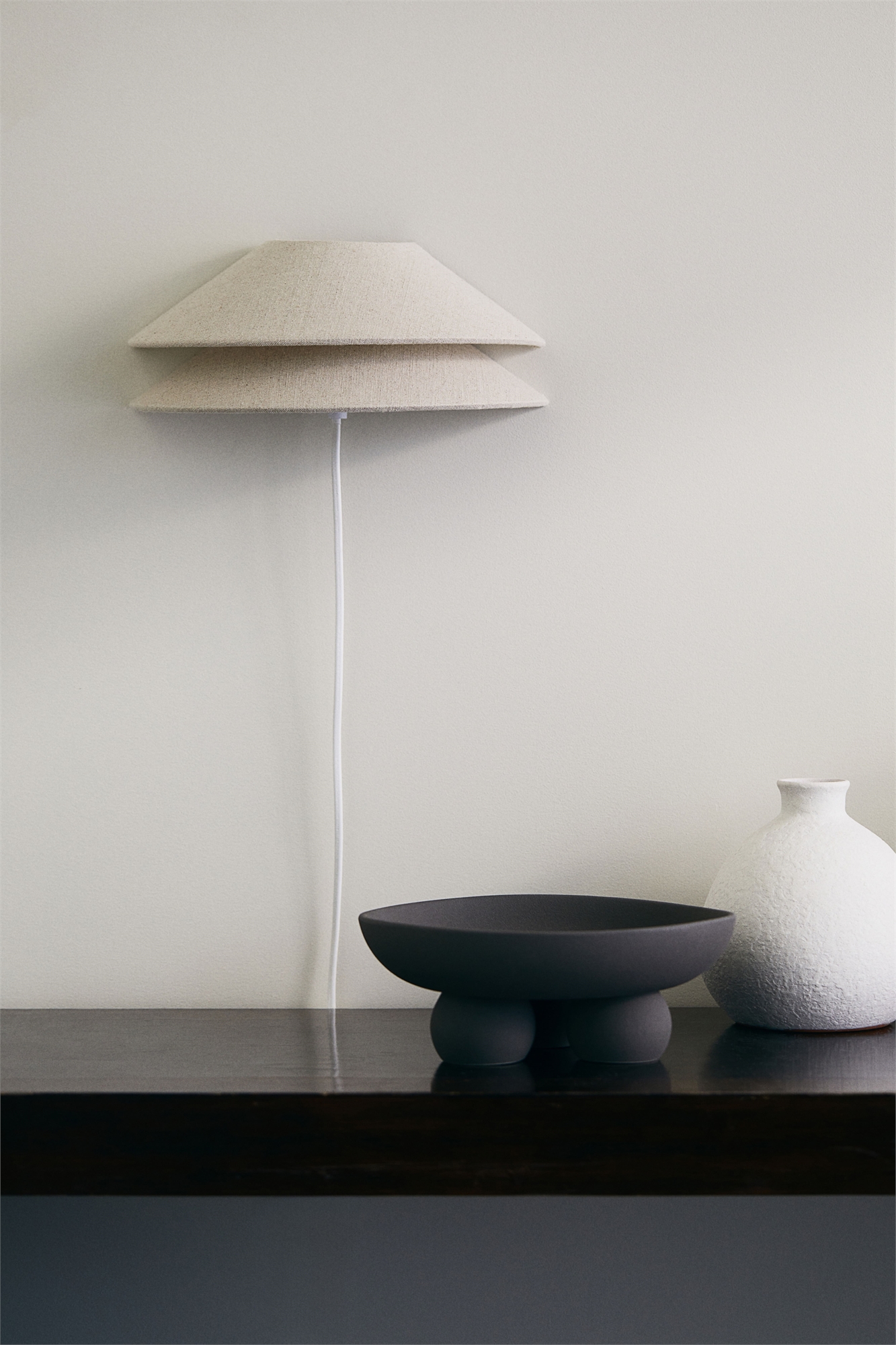 Настенный светильник с абажуром из двух наклонных льняных дисков, которые рассеивают свет и создают теплую и уютную атмосферу. Металлическое настенное крепление и шнур с пластиковым выключателем. Патрон для лампы G9. Максимальная мощность 4 Вт. Лампочка в комплект не входит. Высота 11,5 см. Глубина 14 см. Диаметр абажура 28 см.