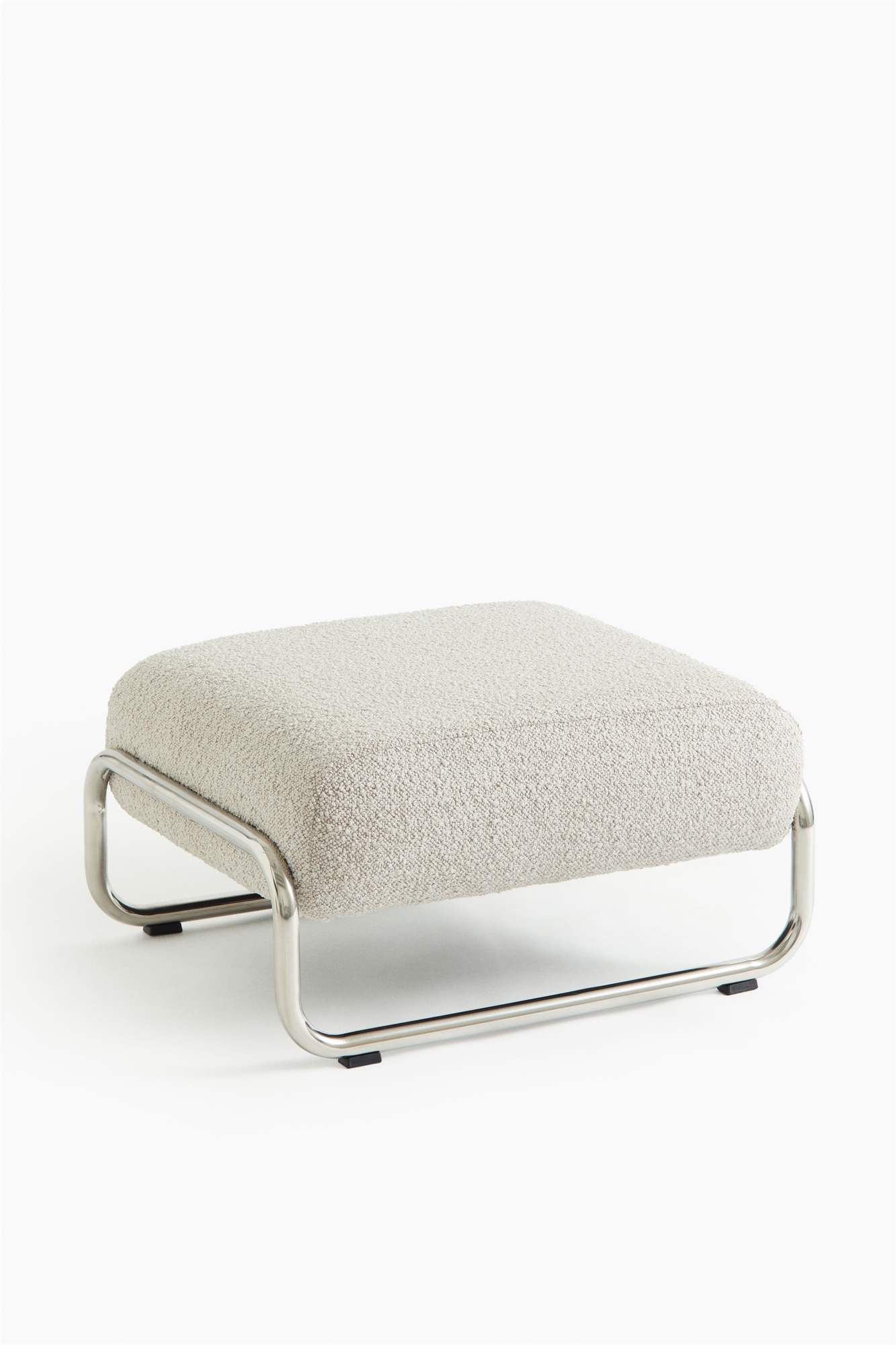 Изящный и современный табурет для ног из металла и мягкого букле, который придает табурету привлекательный вид. Высота 33 см. Глубина 52 см. Ширина 62,5 см. Полностью собран.