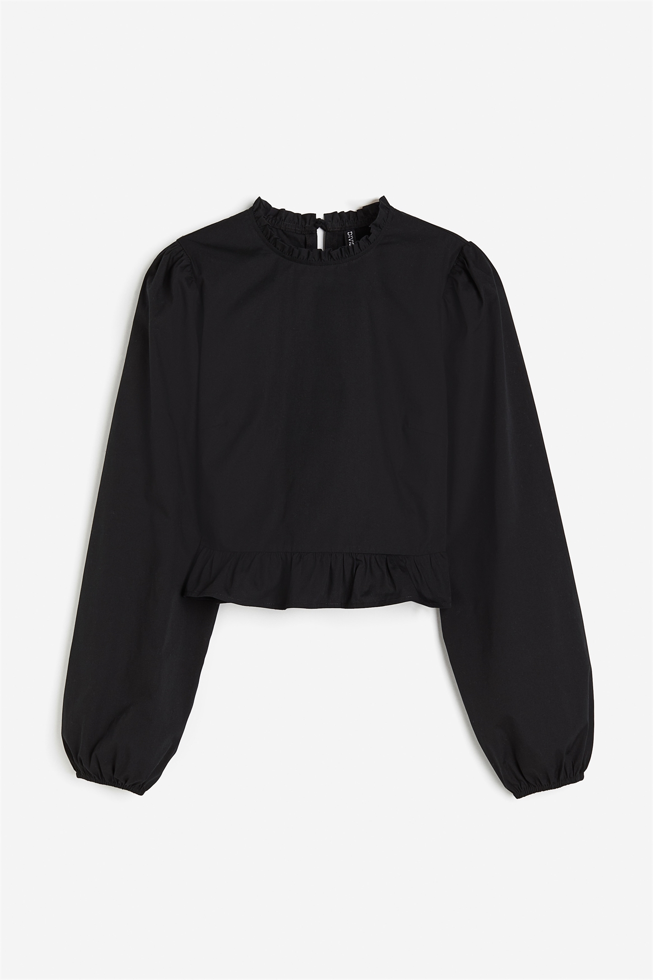 Короткая приталенная блузка из хрустящего хлопкового поплина с жатым воротником и прорезью для ключа с узкими завязками сзади на шее. Длинные пышные рукава, узкая резинка на манжетах и расклешенный пеплум.