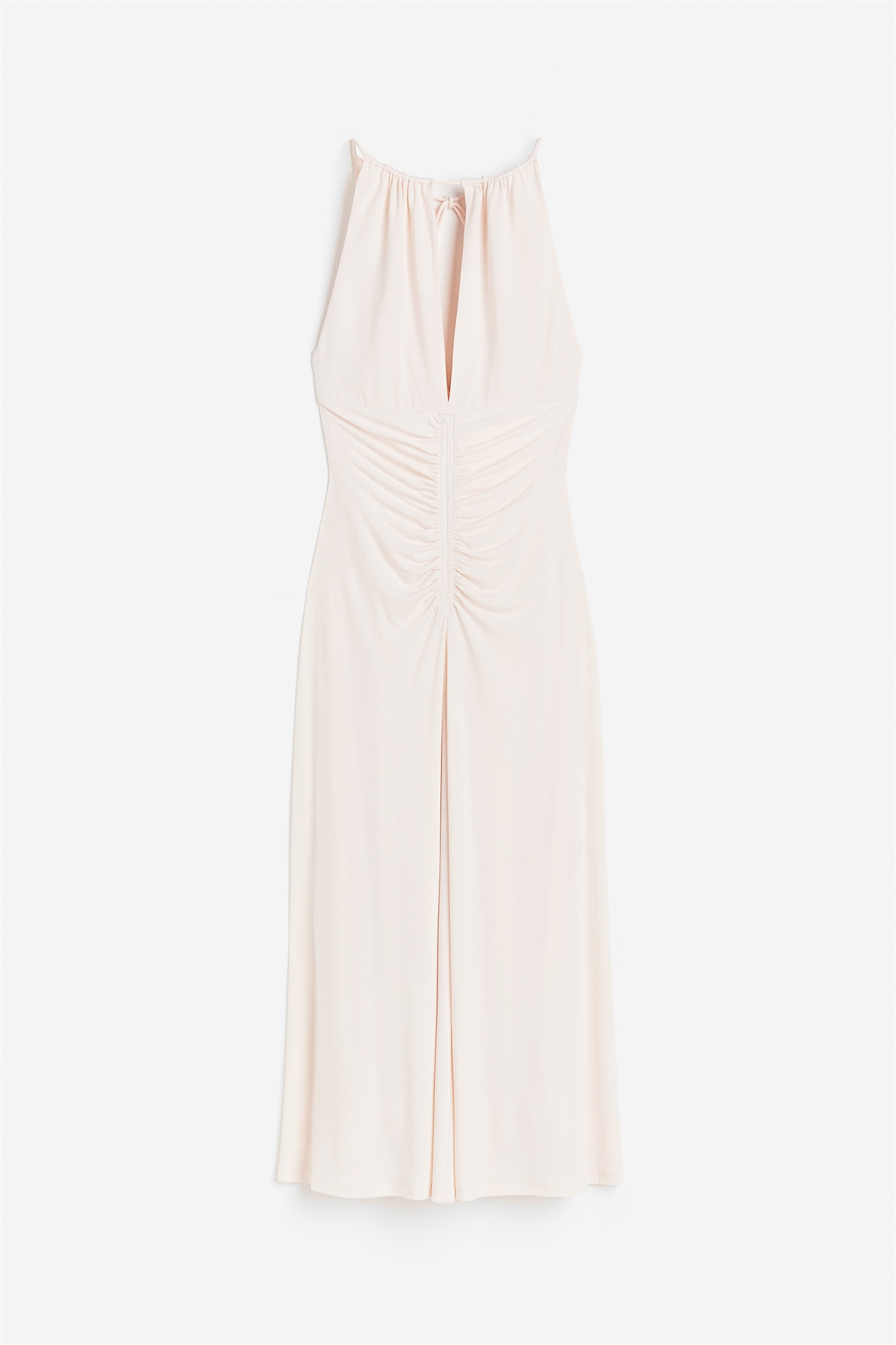 Приталенное платье без рукавов длиной до щиколоток из мягкого джерси. Узкий крой в верхней части с завязками на шее. Глубокая пройма спереди и сзади, эластичный шов спереди, создающий эффект драпировки.