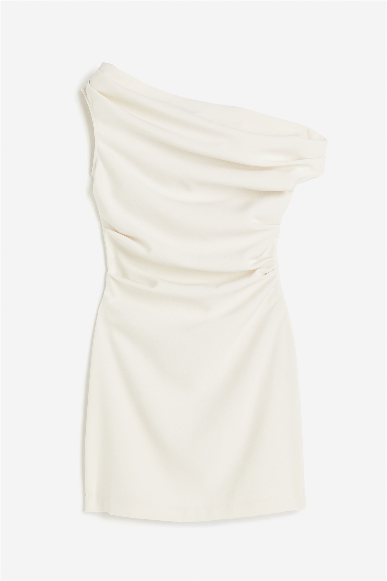 Короткое, приталенное платье на одно плечо из тканого материала с широкой бретелью через одно плечо и широкой панелью вокруг другого. Потайная застежка-молния с одной стороны и сборки на талии с одной стороны для создания эффекта драпировки. Без подкладки.