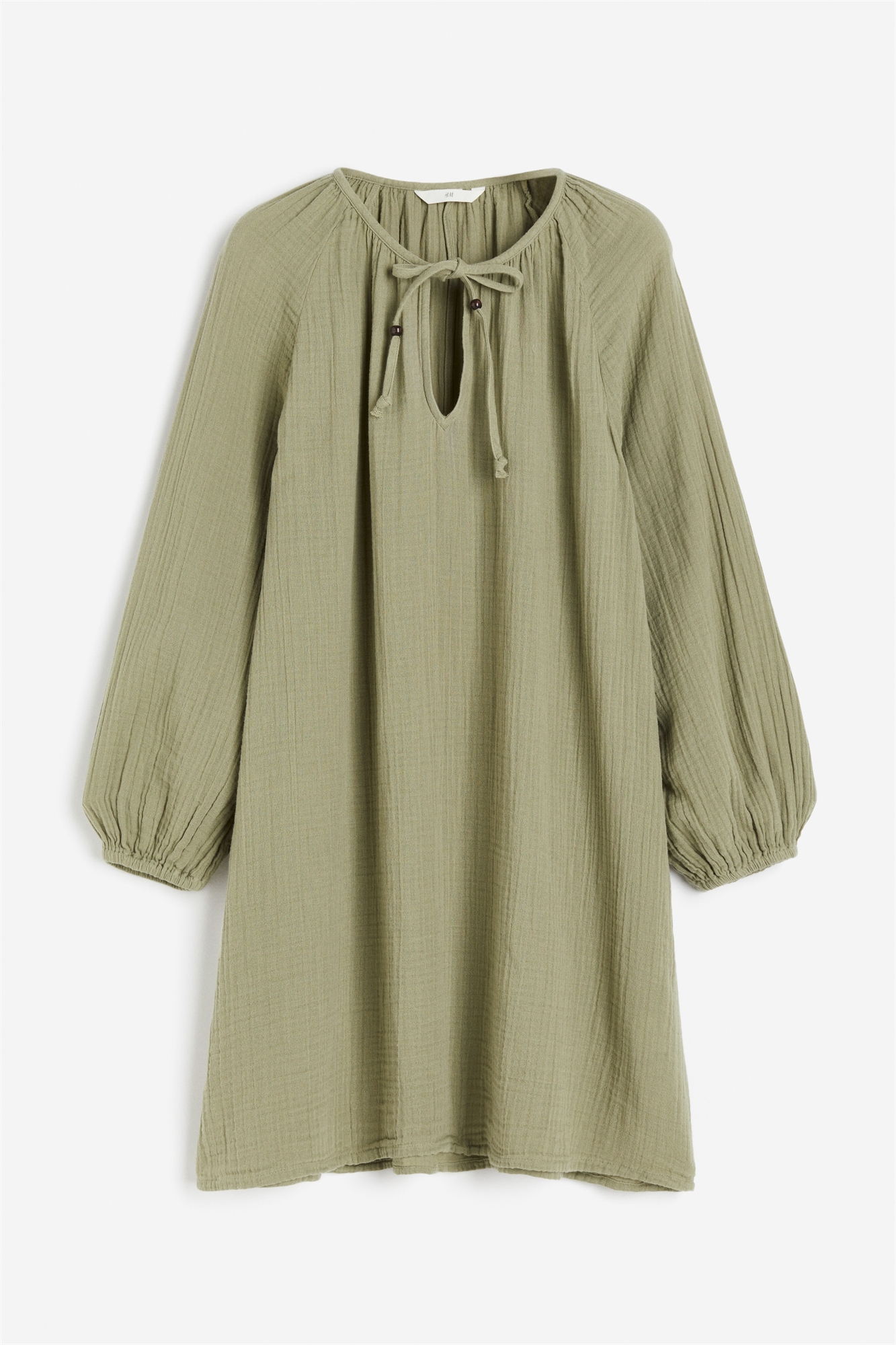 Короткое платье-туника свободного покроя из тканого материала с круглым, сборчатым вырезом и V-образной проймой с узкими завязками спереди. Длинные рукава реглан с узкими эластичными манжетами. Без подкладки.