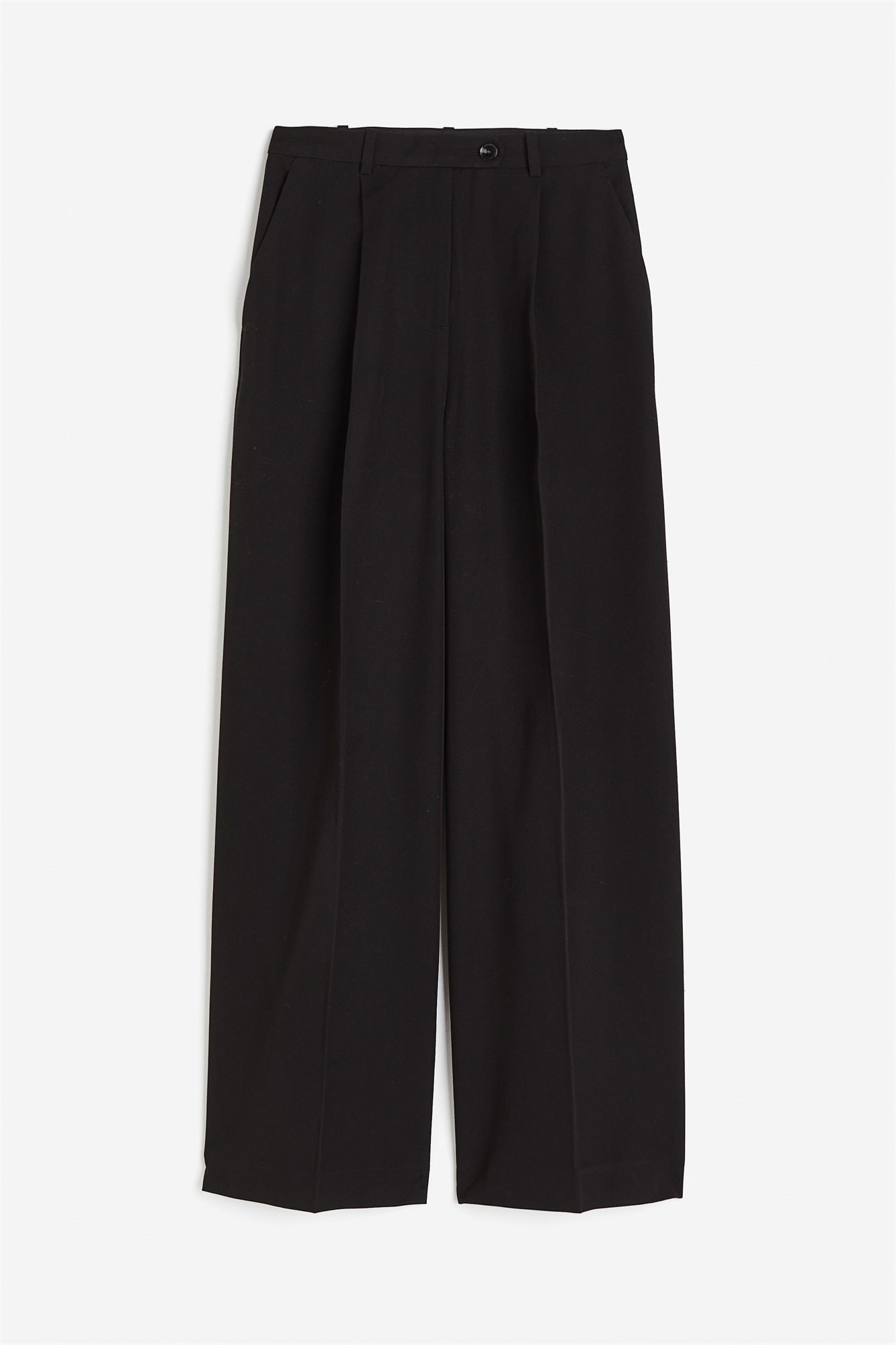 Свободные приталенные брюки из саржи с высокой талией со скрытой резинкой, ширинкой на молнии и удлиненным поясом с пуговицей. Диагональные боковые карманы и фальшивый накладной карман с пуговицей сзади. Широкие прямые ноги со складками в верхней части и складками спереди и сзади.