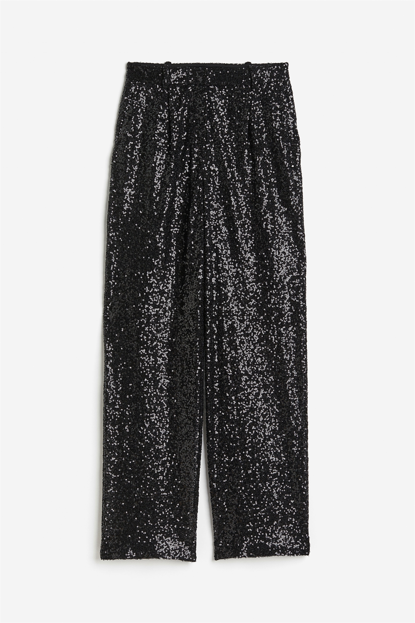 Свободные мерцающие брюки с высокой талией, ширинкой на молнии и застежками-крючками, диагональными боковыми карманами и прямыми ногами со складками в верхней части.