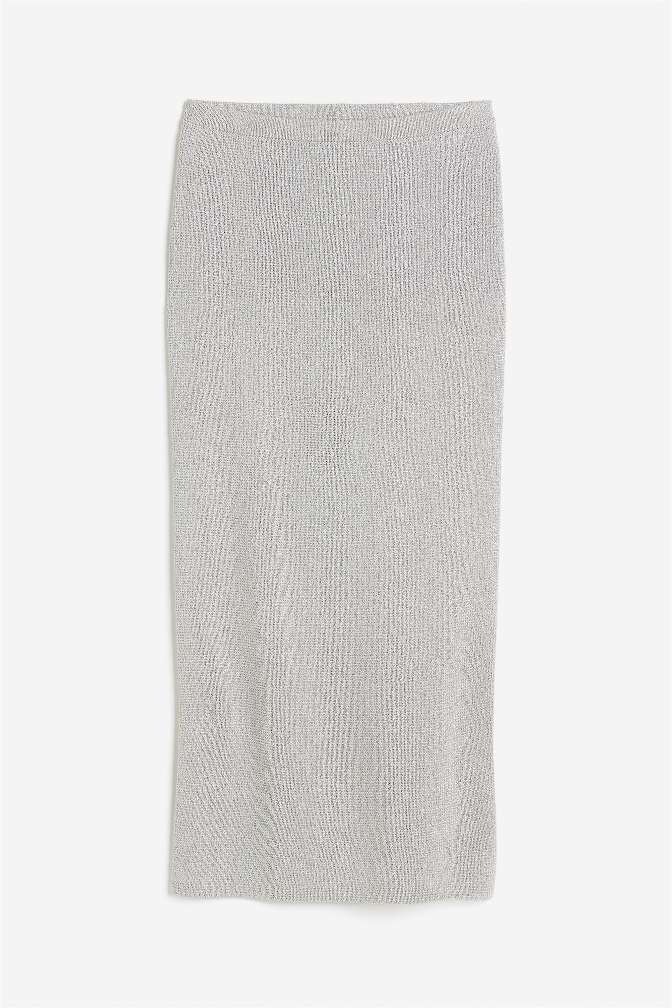 Приталенная юбка длиной до колен из трикотажа с блестящими нитями. Высокая талия с утяжкой и прямой подол.