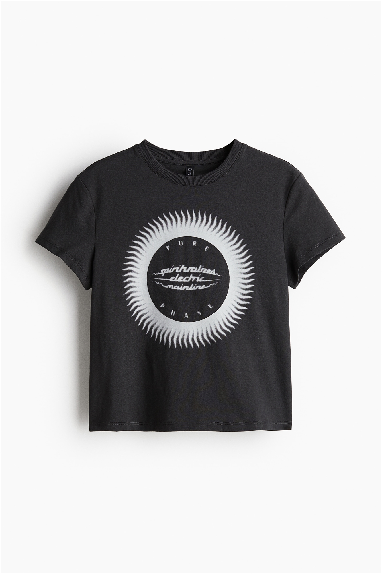 Короткая приталенная футболка из мягкого хлопкового джерси с принтом спереди. Ребристая отделка по вырезу горловины и прямой подол.